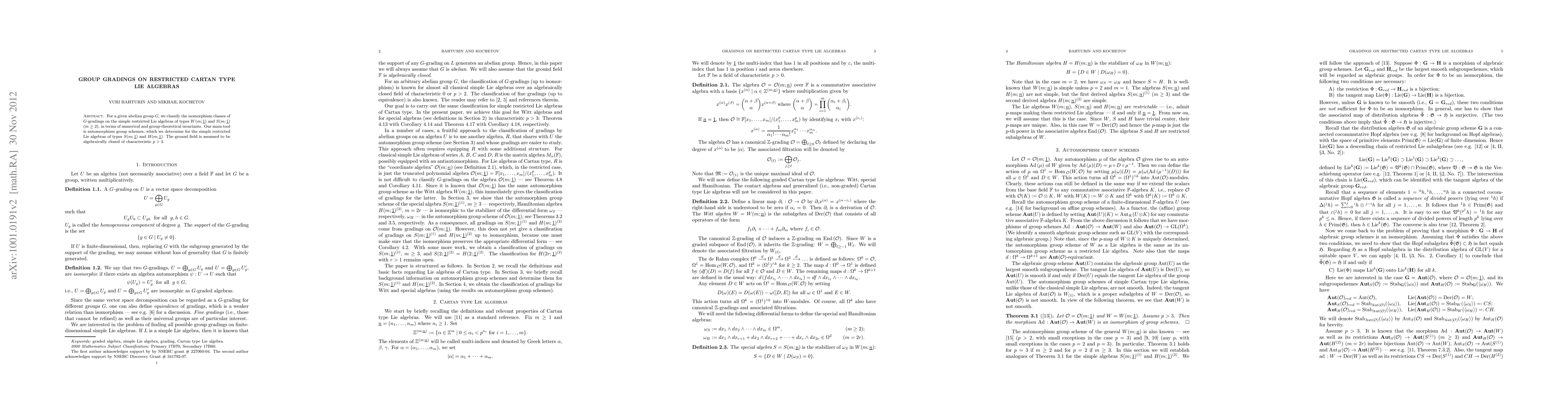 This paper classifies G-gradings on simple restricted Cartan type Lie algebras of types W(m;1) and S(m;1) for an abelian group G, using automorphism group schemes and focusing on algebraically closed fields of characteristic p>3. It employs numerical and group-theoretical invariants to distinguish isomorphism classes.