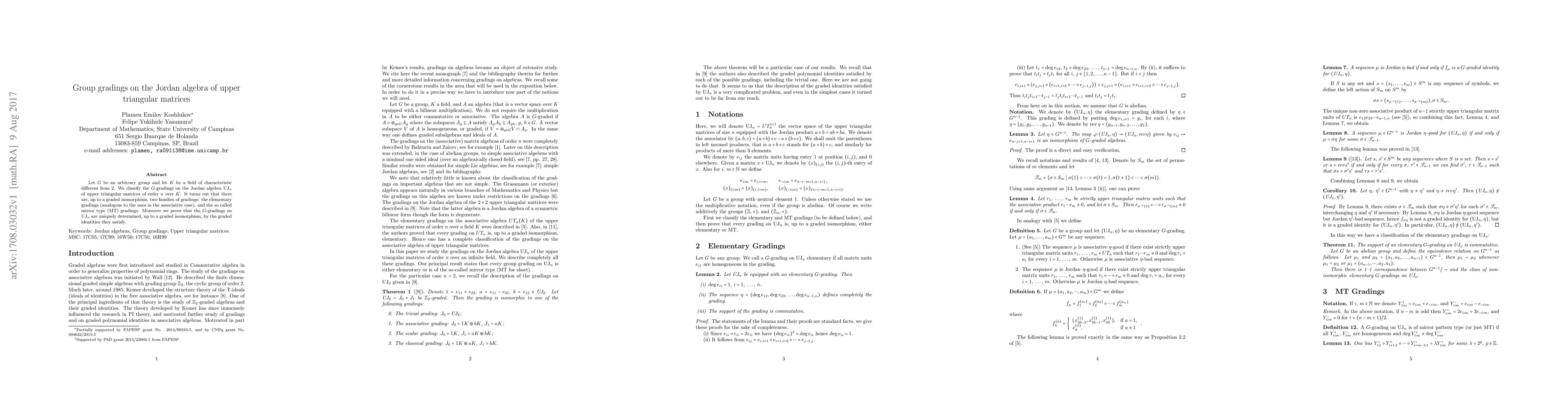 This paper classifies G-gradings on the Jordan algebra of upper triangular matrices over a field K, revealing two main families: elementary gradings and mirror type gradings. It also proves that these gradings are uniquely determined by their graded identities.