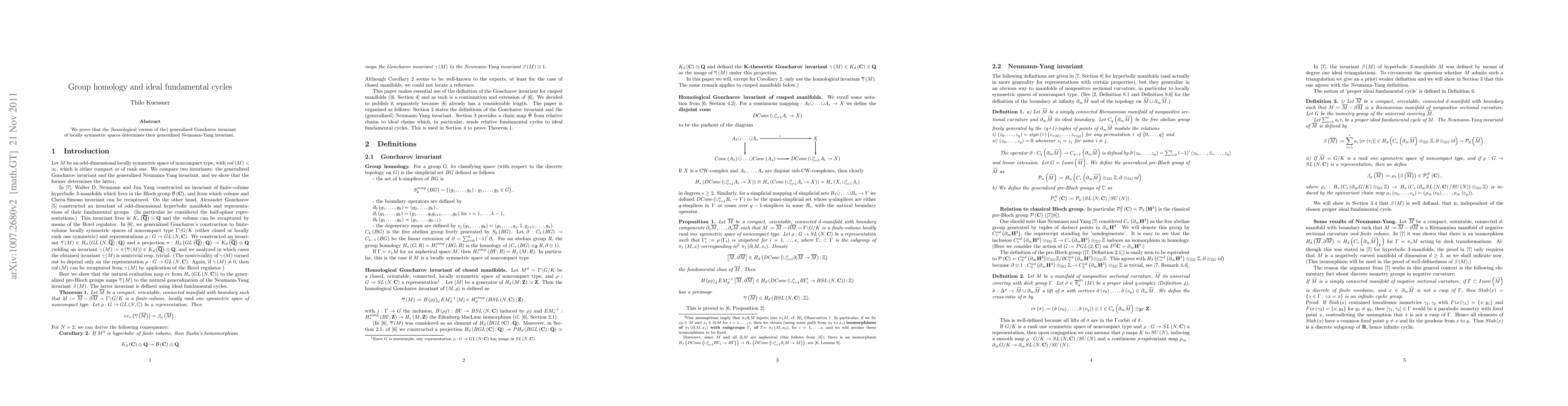 Summary: The paper establishes a connection between group homology and ideal fundamental cycles by proving that the group-homological version of Goncharov's invariant determines the generalized Neumann-Yang invariant in finite-volume locally rank one symmetric spaces.