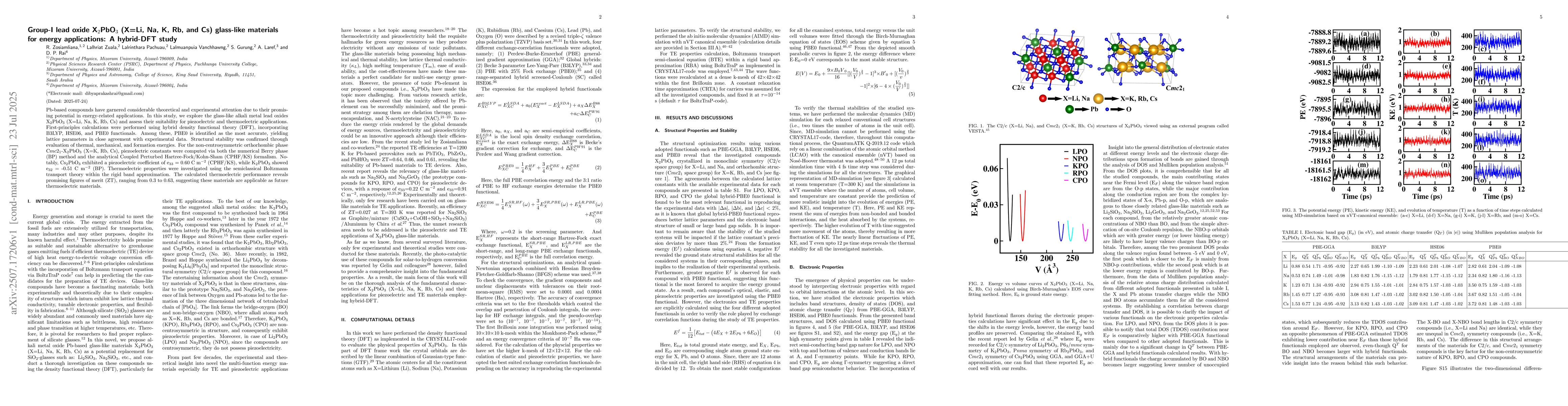 This study uses hybrid DFT calculations to explore the glass-like alkali metal lead oxides X2PbO3 (X=Li, Na, K, Rb, Cs) for energy applications. It identifies PBE0 as the most accurate functional, confirms structural stability, and computes piezoelectric constants for non-centrosymmetric phases. Thermoelectric properties are also investigated, revealing promising figures of merit (ZT) for future thermoelectric material applications.