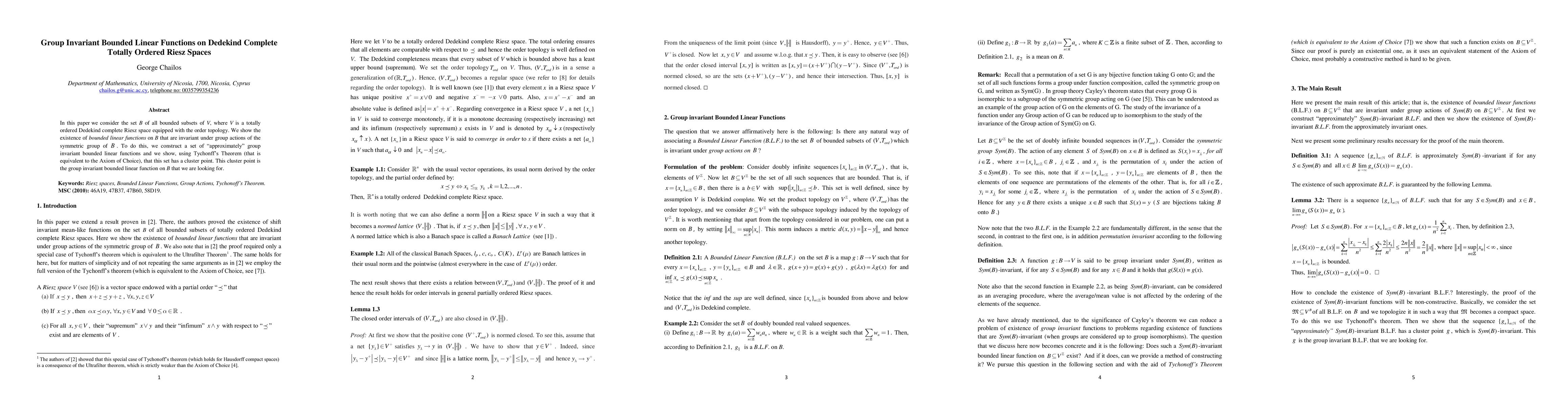 This paper investigates bounded linear functions on Dedekind complete totally ordered Riesz spaces, demonstrating the existence of such functions that remain invariant under the group actions of the symmetric group. The study is framed within the order topology of these bounded subsets.
