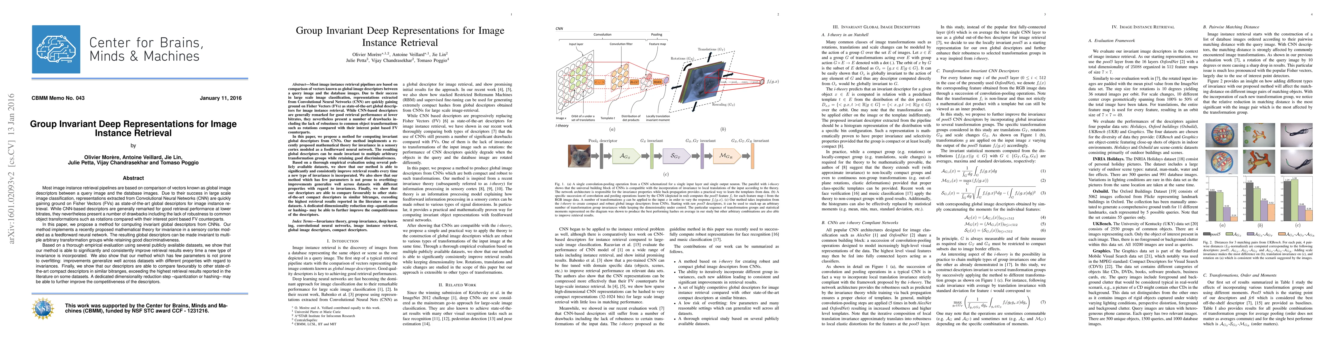 This paper proposes a method for generating invariant global descriptors from Convolutional Neural Networks (CNNs) to improve image instance retrieval performance. The method leverages a mathematical theory for invariance in neural networks, resulting in descriptors that are robust to object transformations while maintaining discriminativeness. Empirical evaluations show consistent improvements across datasets and competitive performance compared to other state-of-the-art descriptors.