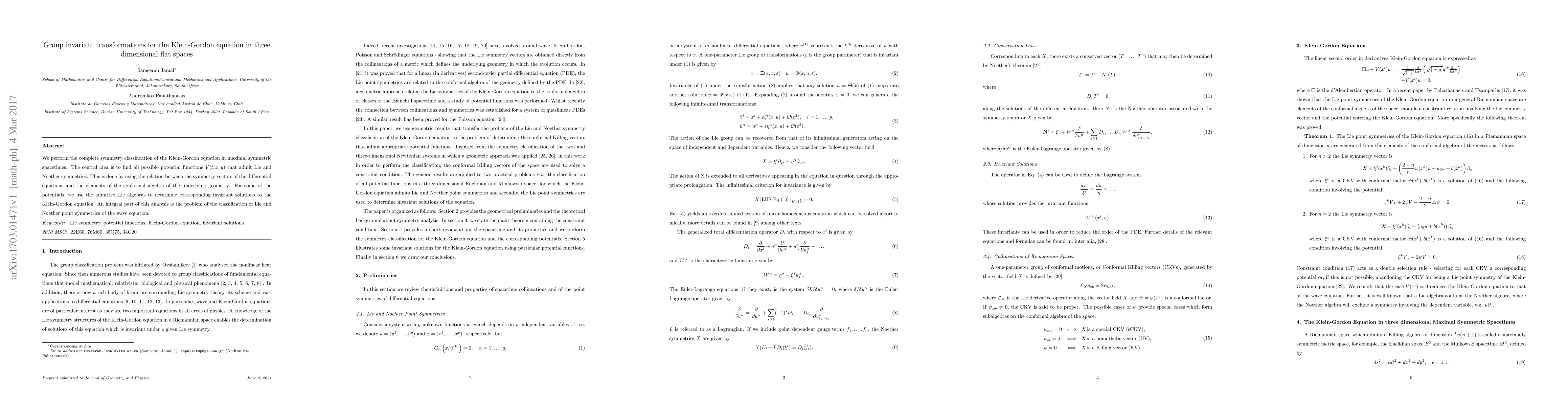 This paper classifies the symmetries of the Klein-Gordon equation in three-dimensional flat spaces, identifying potential functions that admit Lie and Noether symmetries through the conformal algebra of the geometry. It also determines invariant solutions using the identified symmetry algebras.