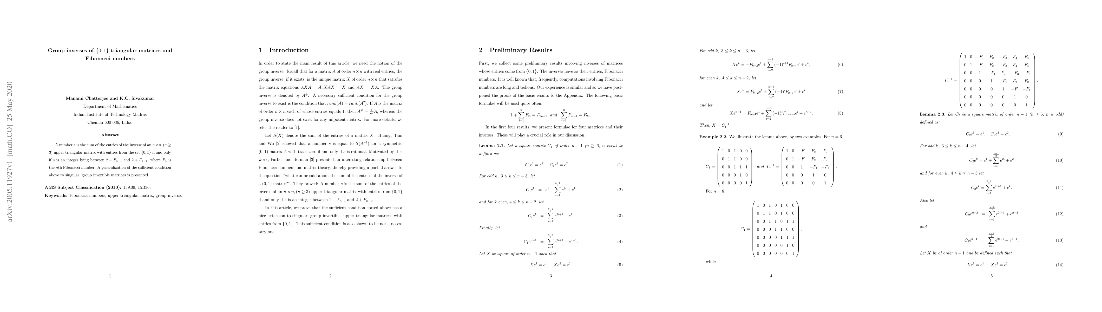 The sum of entries in the inverse of a specific type of matrix is related to Fibonacci numbers, with a range that determines integer sums between $2-F_n$ and $2+F_n$. This relationship holds for both upper triangular and singular, group invertible matrices.