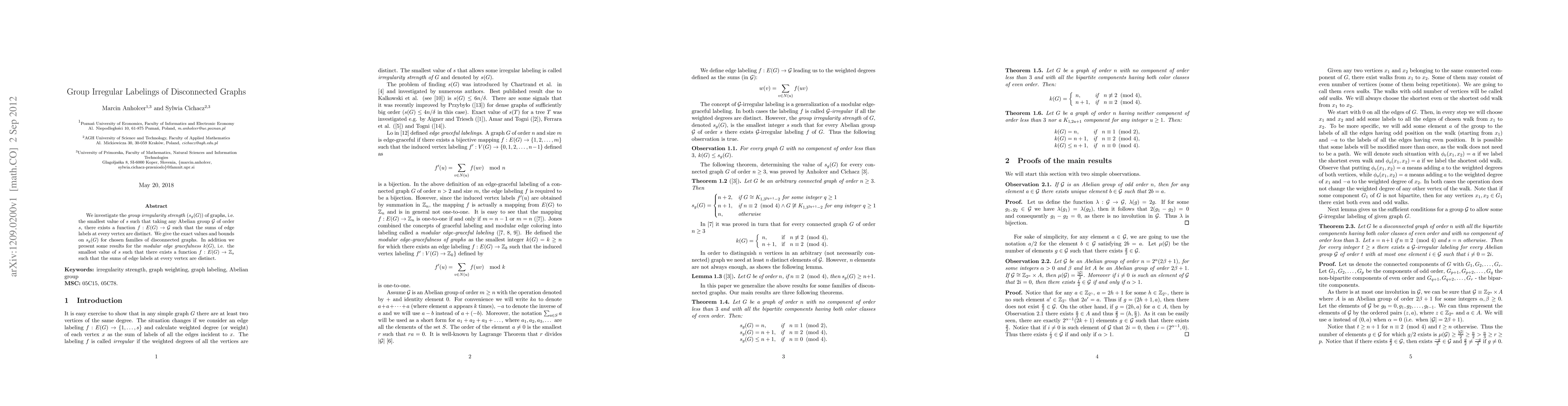 We investigate the \textit{group irregularity strength} ($s_g(G)$) of graphs, i.e. the smallest value of $s$ such that taking any Abelian group $\gr$ of order $s$, there exists a function $f:E(G)\rightarrow \gr$ such that the sums of edge labels at every vertex are distinct. We give the exact values and bounds on $s_g(G)$ for chosen families of disconnected graphs. In addition we present some results for the \textit{modular edge gracefulness} $k(G)$, i.e. the smallest value of $s$ such that there exists a function $f:E(G)\rightarrow \zet_s$ such that the sums of edge labels at every vertex are distinct.