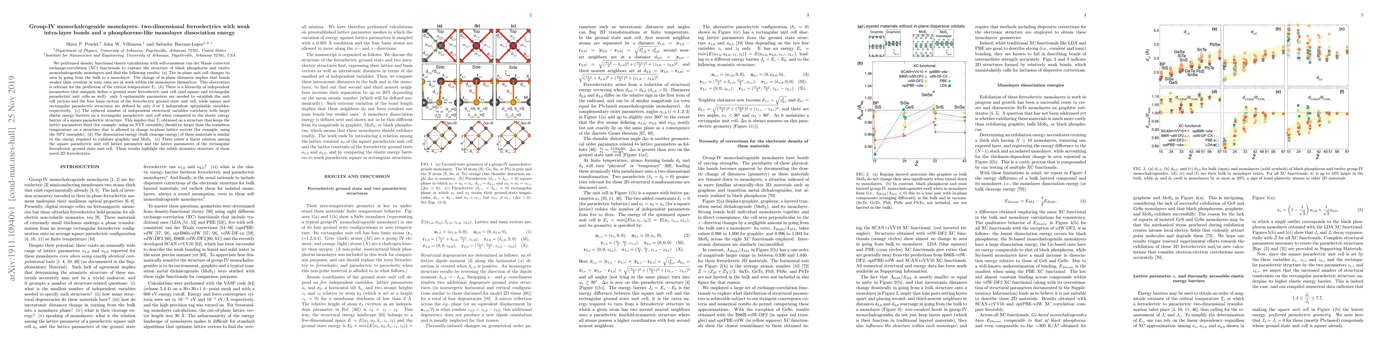 We performed density functional theory calculations with self-consistent van der Waals corrected exchange-correlation (XC) functionals to capture the structure of black phosphorus and twelve monochalcogenide monolayers and find the following results: (a) The in-plane unit cell changes its area in going from the bulk to a monolayer. The change of in-plane distances implies that bonds weaker than covalent or ionic ones are at work within the monolayers themselves. This observation is relevant for the prediction of the critical temperature $T_c$. (b) There is a hierarchy of independent parameters that uniquely define a ground state ferroelectric unit cell (and square and rectangular paraelectric unit cells as well): only 5 optimizable parameters are needed to establish the unit cell vectors and the four basis vectors of the ferroelectric ground state unit cell, while square and rectangular paraelectric structures are defined by only 3 or 2 independent optimizable variables, respectively. (c) The reduced number of independent structural variables correlates with larger elastic energy barriers on a rectangular paraelectric unit cell when compared to the elastic energy barrier of a square paraelectric structure. This implies that $T_c$ obtained on a structure that keeps the lattice parameters fixed (for example, using an NVT ensemble) should be larger than the transition temperature on a structure that is allowed to change in-plane lattice vectors (for example, using the NPT ensemble). (d) The dissociation energy (bulk cleavage energy) of these materials is similar to the energy required to exfoliate graphite and MoS$_2$. (e) There exists a linear relation among the square paraelectric unit cell lattice parameter and the lattice parameters of the rectangular ferroelectric ground state unit cell. These results highlight the subtle atomistic structure of these novel 2D ferroelectrics.