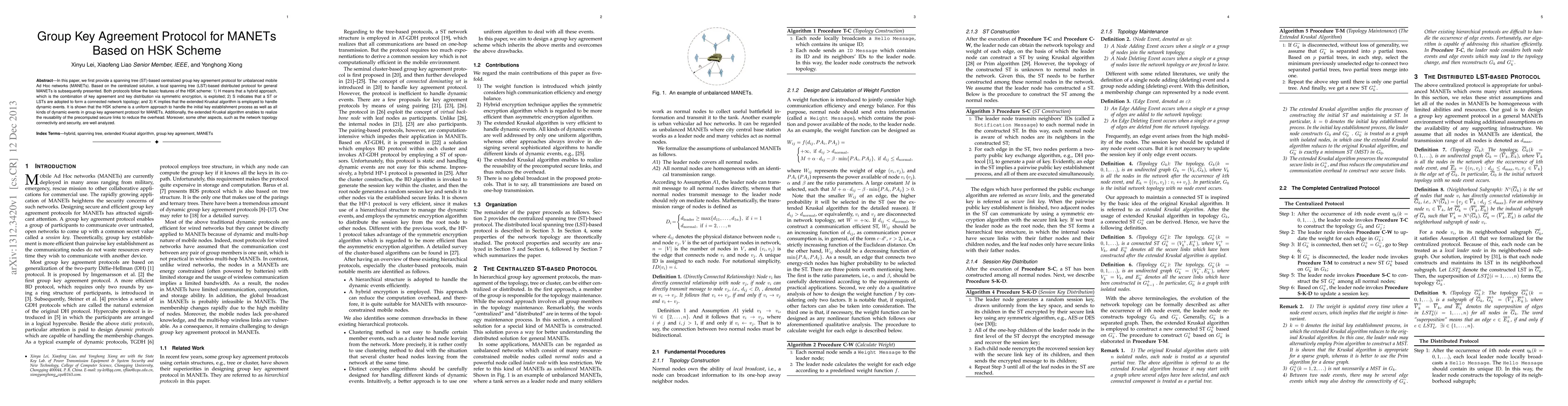 This paper proposes two group key agreement protocols for MANETs based on the HSK scheme: a centralized spanning tree-based protocol and a distributed local spanning tree-based protocol. Both utilize a hybrid approach combining key agreement and distribution via symmetric encryption, and leverage the extended Kruskal algorithm for dynamic event management, enhancing network topology connectivity and security.