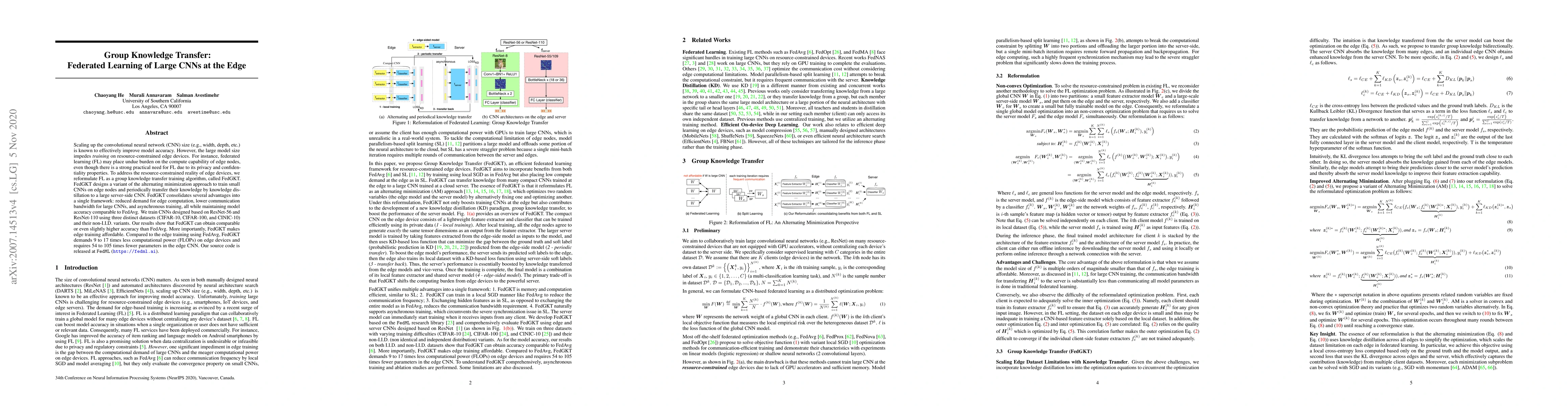 Scaling up the convolutional neural network (CNN) size (e.g., width, depth, etc.) is known to effectively improve model accuracy. However, the large model size impedes training on resource-constrained edge devices. For instance, federated learning (FL) may place undue burden on the compute capability of edge nodes, even though there is a strong practical need for FL due to its privacy and confidentiality properties. To address the resource-constrained reality of edge devices, we reformulate FL as a group knowledge transfer training algorithm, called FedGKT. FedGKT designs a variant of the alternating minimization approach to train small CNNs on edge nodes and periodically transfer their knowledge by knowledge distillation to a large server-side CNN. FedGKT consolidates several advantages into a single framework: reduced demand for edge computation, lower communication bandwidth for large CNNs, and asynchronous training, all while maintaining model accuracy comparable to FedAvg. We train CNNs designed based on ResNet-56 and ResNet-110 using three distinct datasets (CIFAR-10, CIFAR-100, and CINIC-10) and their non-I.I.D. variants. Our results show that FedGKT can obtain comparable or even slightly higher accuracy than FedAvg. More importantly, FedGKT makes edge training affordable. Compared to the edge training using FedAvg, FedGKT demands 9 to 17 times less computational power (FLOPs) on edge devices and requires 54 to 105 times fewer parameters in the edge CNN. Our source code is released at FedML (https://fedml.ai).