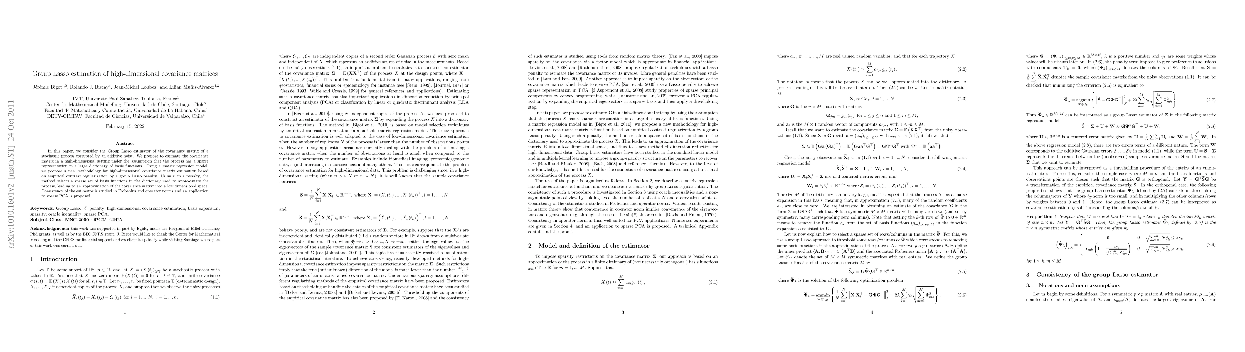 This paper proposes a Group Lasso estimator for high-dimensional covariance matrices in noisy stochastic processes, assuming a sparse representation in a basis function dictionary. The method uses empirical contrast regularization to select a sparse set of basis functions, ensuring consistency in Frobenius and operator norms, and an application to sparse PCA is demonstrated.