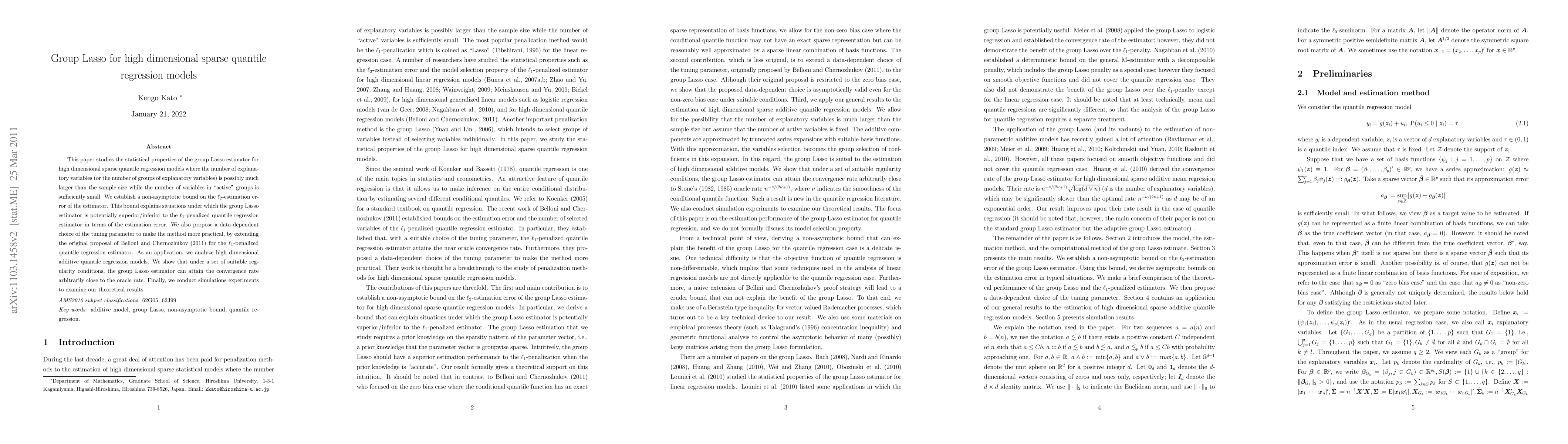 This paper investigates the group Lasso estimator for high-dimensional sparse quantile regression, providing a non-asymptotic bound on its $\ell_{2}$-estimation error and comparing it to the $\ell_{1}$-penalized estimator. It proposes a data-dependent tuning parameter choice and demonstrates its effectiveness through simulations and analysis of high-dimensional additive quantile regression models.