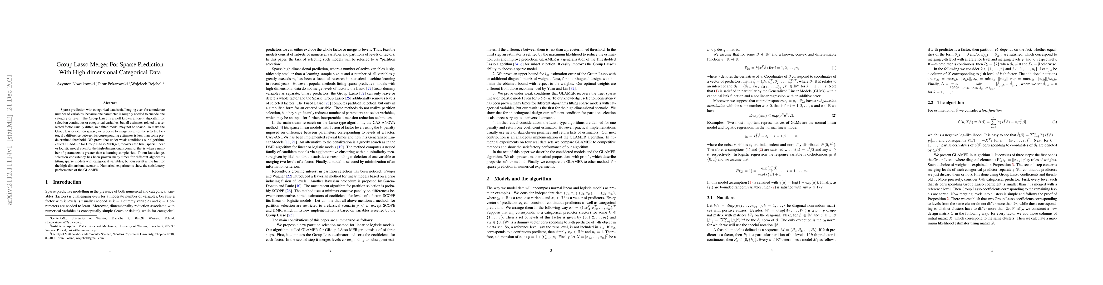 The paper proposes GLAMER, a Group Lasso merger algorithm to enhance sparse prediction with high-dimensional categorical data by merging similar levels of selected factors, ensuring model sparsity. The authors prove GLAMER's selection consistency in high-dimensional scenarios, a first for such settings, and demonstrate its effectiveness through numerical experiments.