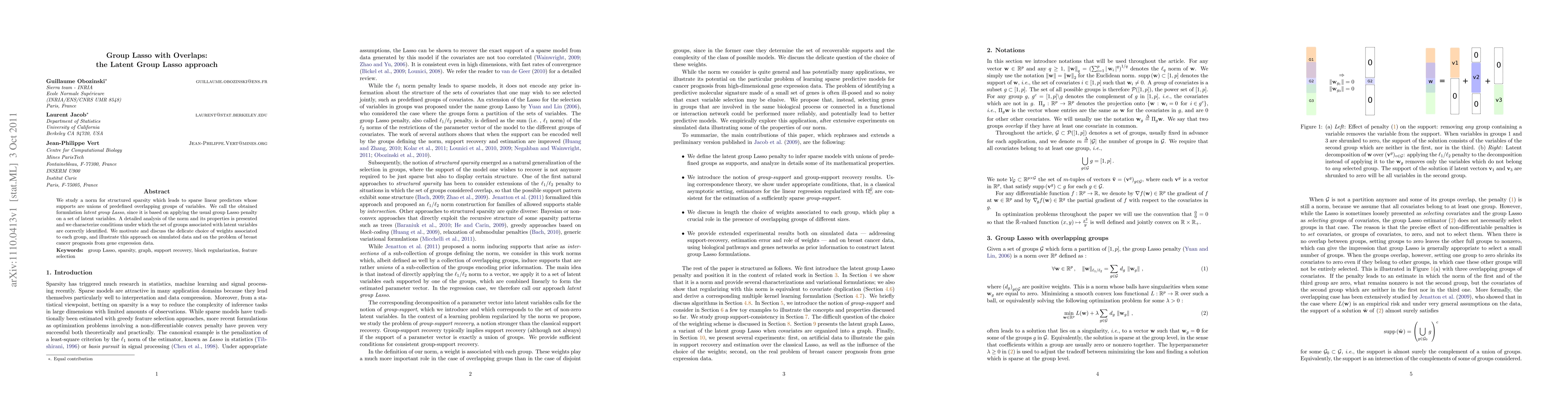 We study a norm for structured sparsity which leads to sparse linear predictors whose supports are unions of prede ned overlapping groups of variables. We call the obtained formulation latent group Lasso, since it is based on applying the usual group Lasso penalty on a set of latent variables. A detailed analysis of the norm and its properties is presented and we characterize conditions under which the set of groups associated with latent variables are correctly identi ed. We motivate and discuss the delicate choice of weights associated to each group, and illustrate this approach on simulated data and on the problem of breast cancer prognosis from gene expression data.