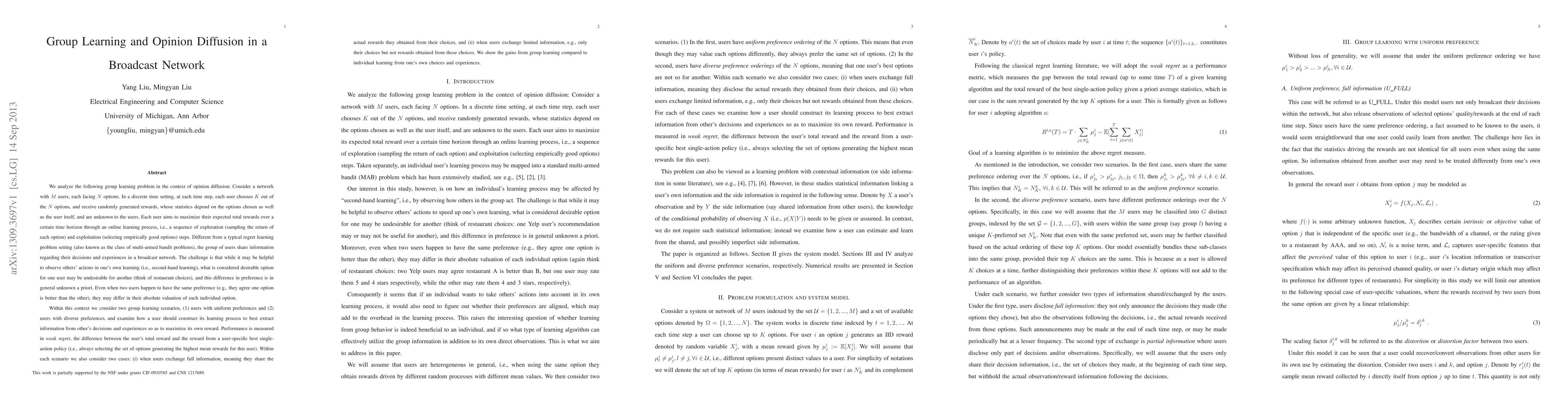 We analyze the following group learning problem in the context of opinion diffusion: Consider a network with $M$ users, each facing $N$ options. In a discrete time setting, at each time step, each user chooses $K$ out of the $N$ options, and receive randomly generated rewards, whose statistics depend on the options chosen as well as the user itself, and are unknown to the users. Each user aims to maximize their expected total rewards over a certain time horizon through an online learning process, i.e., a sequence of exploration (sampling the return of each option) and exploitation (selecting empirically good options) steps. Within this context we consider two group learning scenarios, (1) users with uniform preferences and (2) users with diverse preferences, and examine how a user should construct its learning process to best extract information from other's decisions and experiences so as to maximize its own reward. Performance is measured in {\em weak regret}, the difference between the user's total reward and the reward from a user-specific best single-action policy (i.e., always selecting the set of options generating the highest mean rewards for this user). Within each scenario we also consider two cases: (i) when users exchange full information, meaning they share the actual rewards they obtained from their choices, and (ii) when users exchange limited information, e.g., only their choices but not rewards obtained from these choices.