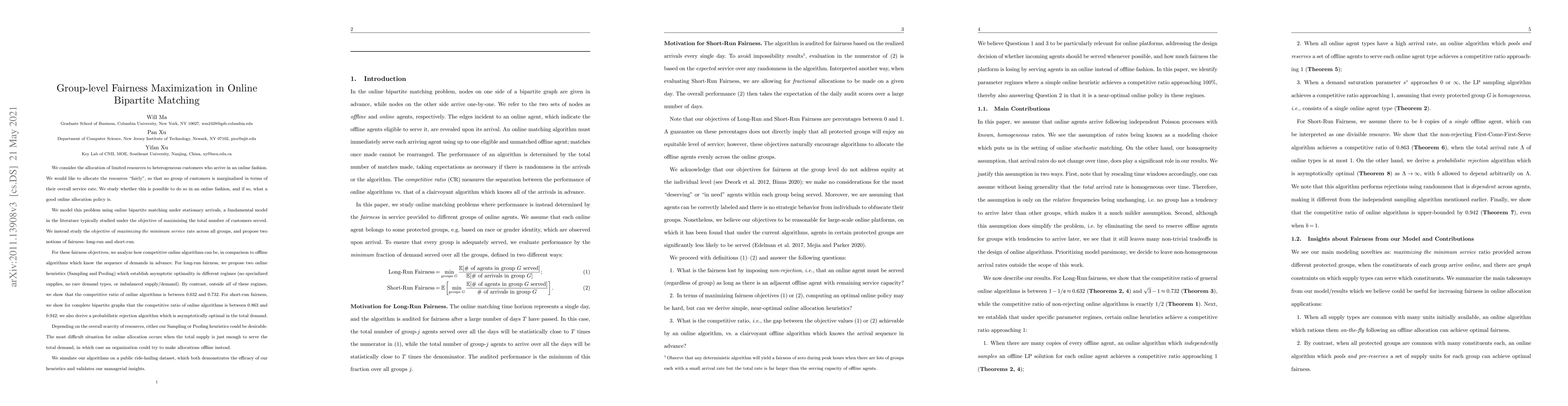 This paper investigates online bipartite matching to fairly allocate limited resources to heterogeneous customers, focusing on maximizing group-level fairness. It proposes two fairness notions—long-run and short-run—and develops online heuristics (Sampling and Pooling) that achieve asymptotic optimality under certain conditions. The study also analyzes the competitive ratio of online algorithms against offline algorithms, finding that online algorithms perform suboptimally in general but are effective under specific resource scarcity scenarios.