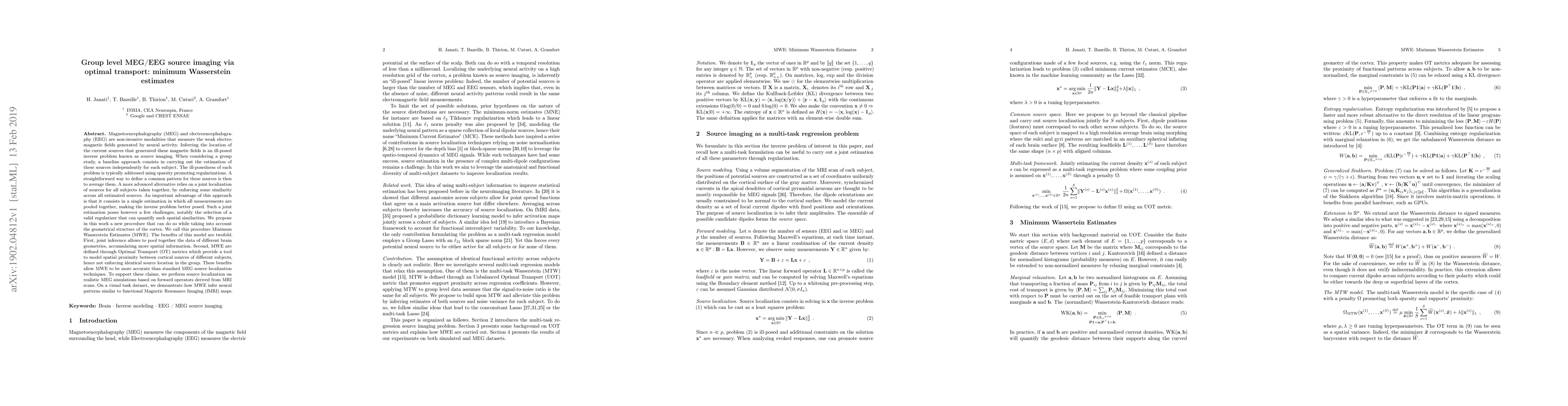 Magnetoencephalography (MEG) and electroencephalogra-phy (EEG) are non-invasive modalities that measure the weak electromagnetic fields generated by neural activity. Inferring the location of the current sources that generated these magnetic fields is an ill-posed inverse problem known as source imaging. When considering a group study, a baseline approach consists in carrying out the estimation of these sources independently for each subject. The ill-posedness of each problem is typically addressed using sparsity promoting regularizations. A straightforward way to define a common pattern for these sources is then to average them. A more advanced alternative relies on a joint localization of sources for all subjects taken together, by enforcing some similarity across all estimated sources. An important advantage of this approach is that it consists in a single estimation in which all measurements are pooled together, making the inverse problem better posed. Such a joint estimation poses however a few challenges, notably the selection of a valid regularizer that can quantify such spatial similarities. We propose in this work a new procedure that can do so while taking into account the geometrical structure of the cortex. We call this procedure Minimum Wasserstein Estimates (MWE). The benefits of this model are twofold. First, joint inference allows to pool together the data of different brain geometries, accumulating more spatial information. Second, MWE are defined through Optimal Transport (OT) metrics which provide a tool to model spatial proximity between cortical sources of different subjects, hence not enforcing identical source location in the group. These benefits allow MWE to be more accurate than standard MEG source localization techniques. To support these claims, we perform source localization on realistic MEG simulations based on forward operators derived from MRI scans. On a visual task dataset, we demonstrate how MWE infer neural patterns similar to functional Magnetic Resonance Imaging (fMRI) maps.