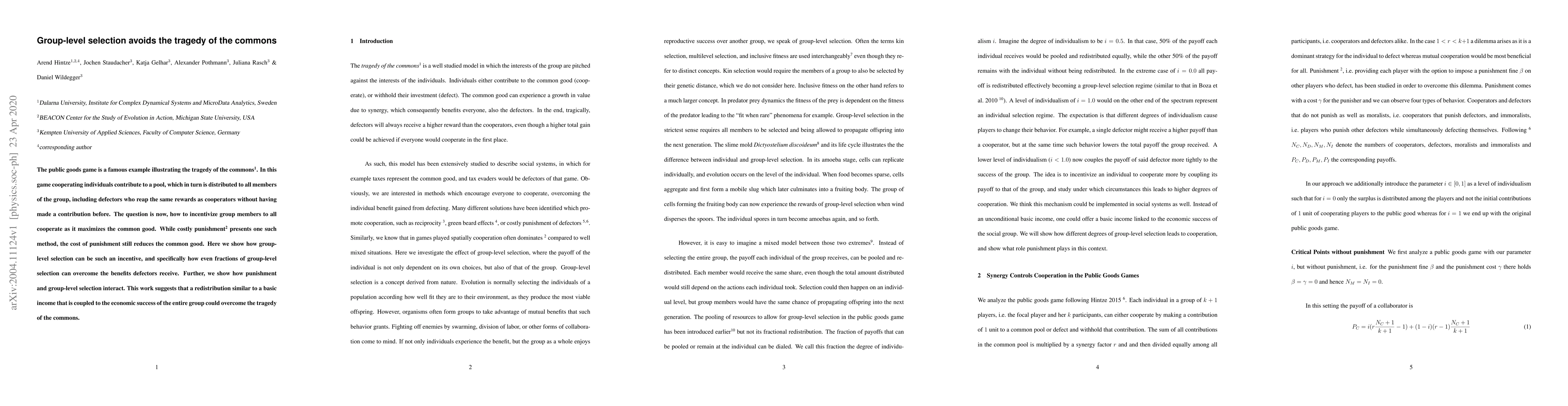 This paper explores how group-level selection can incentivize cooperation in the public goods game, overcoming the tragedy of the commons by eliminating the benefits defectors receive. It also examines the interaction between costly punishment and group-level selection, suggesting that a basic income tied to group success could be an effective solution.