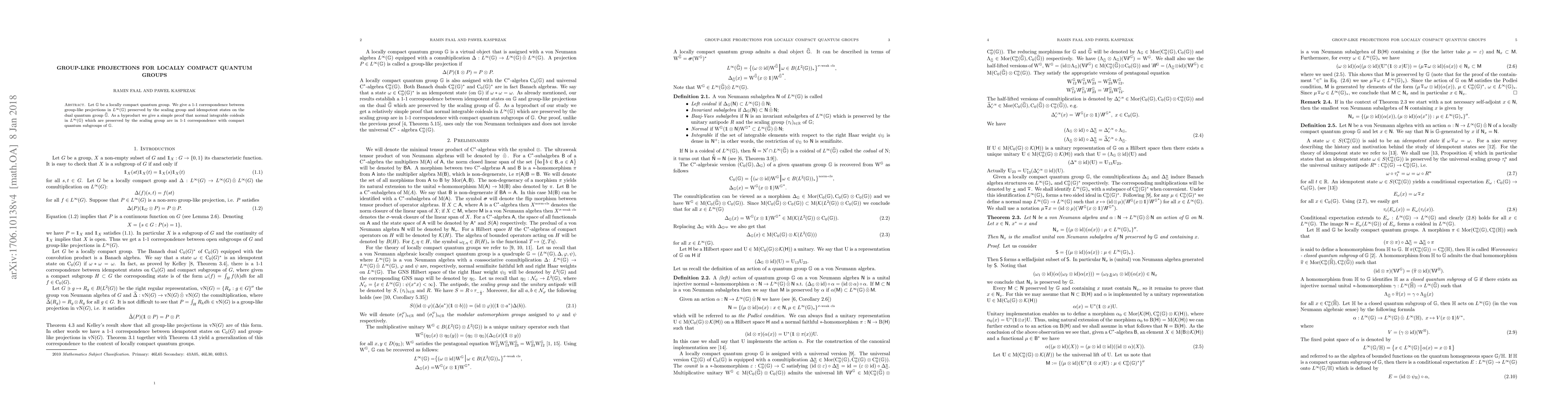 This paper establishes a one-to-one correspondence between group-like projections in the algebra of bounded measurable functions on a locally compact quantum group that are invariant under scaling, and idempotent states on its dual quantum group. It also provides a straightforward proof for the correspondence between normal integrable coideals and compact quantum subgroups.