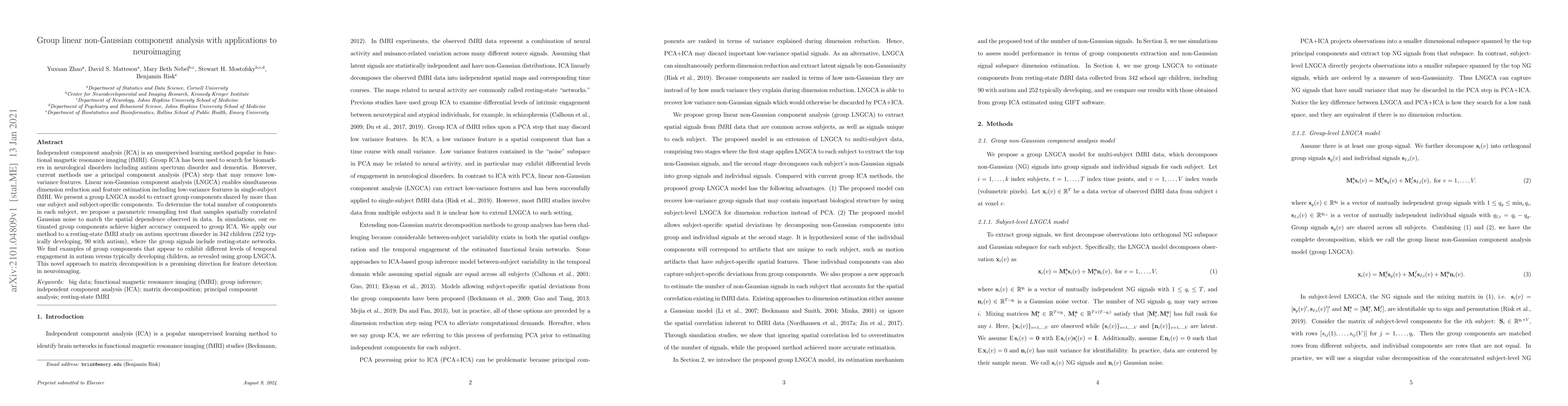 This paper introduces a group linear non-Gaussian component analysis (group LNGCA) model for fMRI data, enhancing the detection of biomarkers in neurological disorders by preserving low-variance features. The proposed method outperforms group ICA in simulations and reveals distinct resting-state network engagement patterns in children with autism spectrum disorder compared to typically developing children.