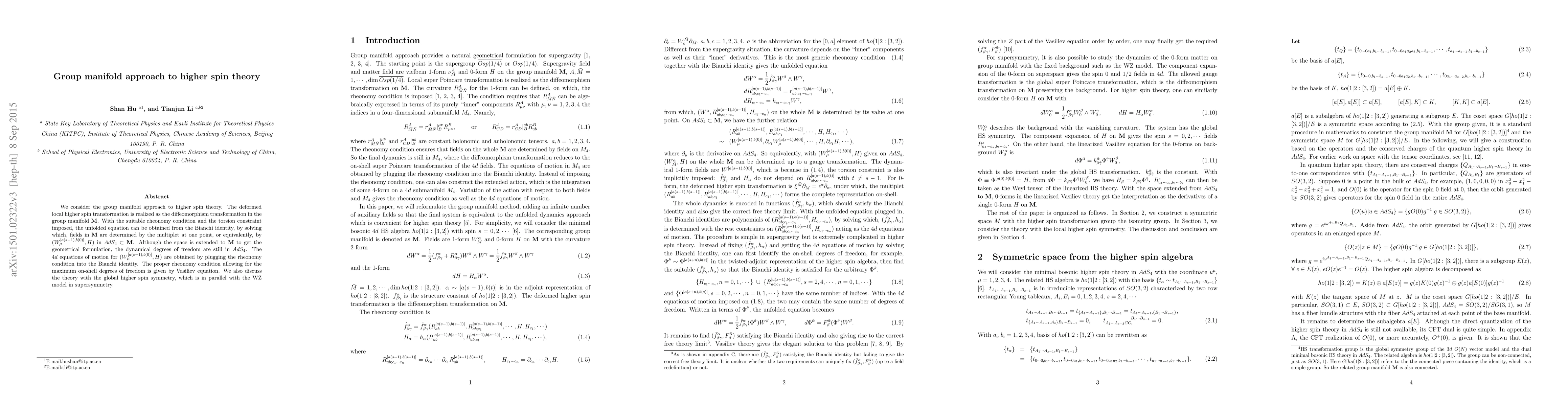 Researchers apply a group manifold approach to higher spin theory, solving for fields in 4D space using the Bianchi identity and rheonomy condition, resulting in equations of motion that capture maximum on-shell degrees of freedom.