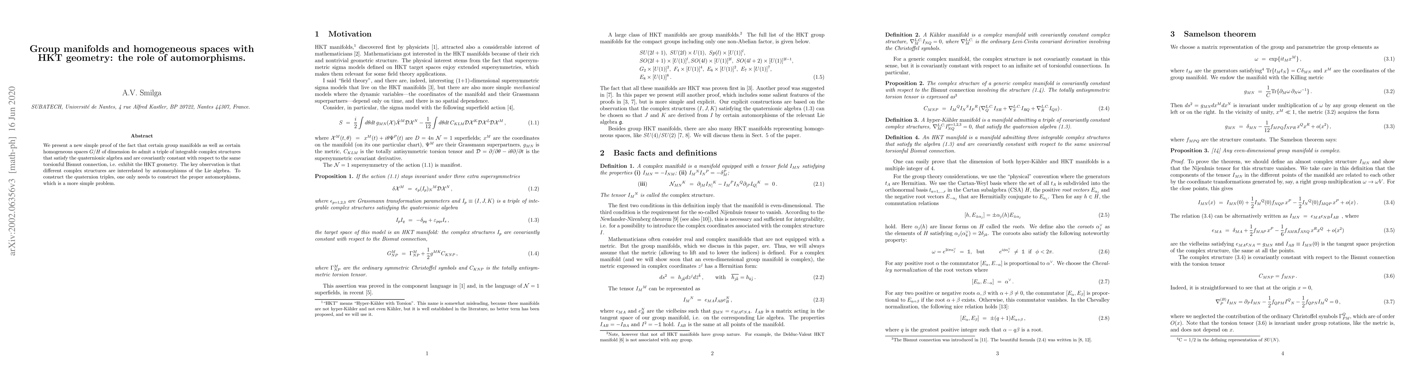 Group manifolds and homogeneous spaces can admit quaternionic triplets of integrable complex structures with HKT geometry through automorphism analysis.