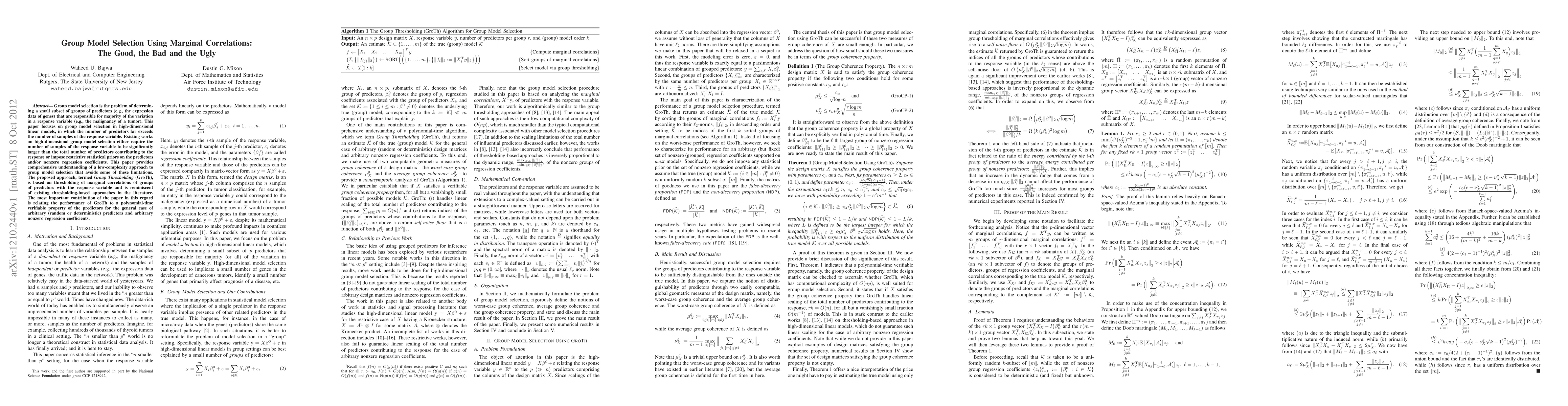 Group model selection is the problem of determining a small subset of groups of predictors (e.g., the expression data of genes) that are responsible for majority of the variation in a response variable (e.g., the malignancy of a tumor). This paper focuses on group model selection in high-dimensional linear models, in which the number of predictors far exceeds the number of samples of the response variable. Existing works on high-dimensional group model selection either require the number of samples of the response variable to be significantly larger than the total number of predictors contributing to the response or impose restrictive statistical priors on the predictors and/or nonzero regression coefficients. This paper provides comprehensive understanding of a low-complexity approach to group model selection that avoids some of these limitations. The proposed approach, termed Group Thresholding (GroTh), is based on thresholding of marginal correlations of groups of predictors with the response variable and is reminiscent of existing thresholding-based approaches in the literature. The most important contribution of the paper in this regard is relating the performance of GroTh to a polynomial-time verifiable property of the predictors for the general case of arbitrary (random or deterministic) predictors and arbitrary nonzero regression coefficients.