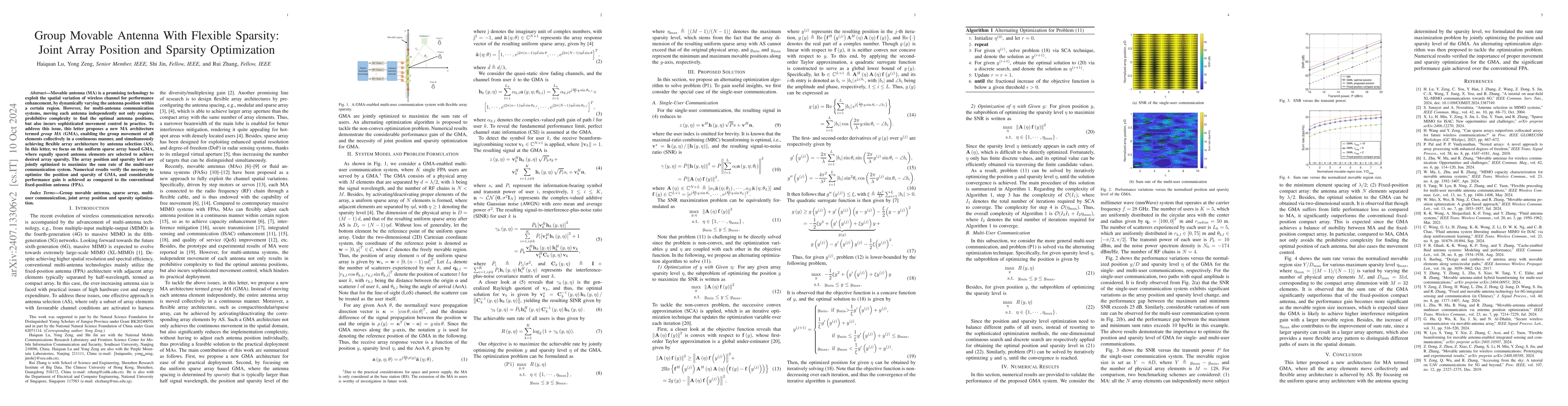 This paper proposes a group movable antenna (GMA) architecture for multi-antenna systems, allowing collective movement and flexible sparsity through antenna selection. The joint optimization of array position and sparsity aims to maximize sum rate in multi-user communications, showing significant performance gains over fixed-position antennas.