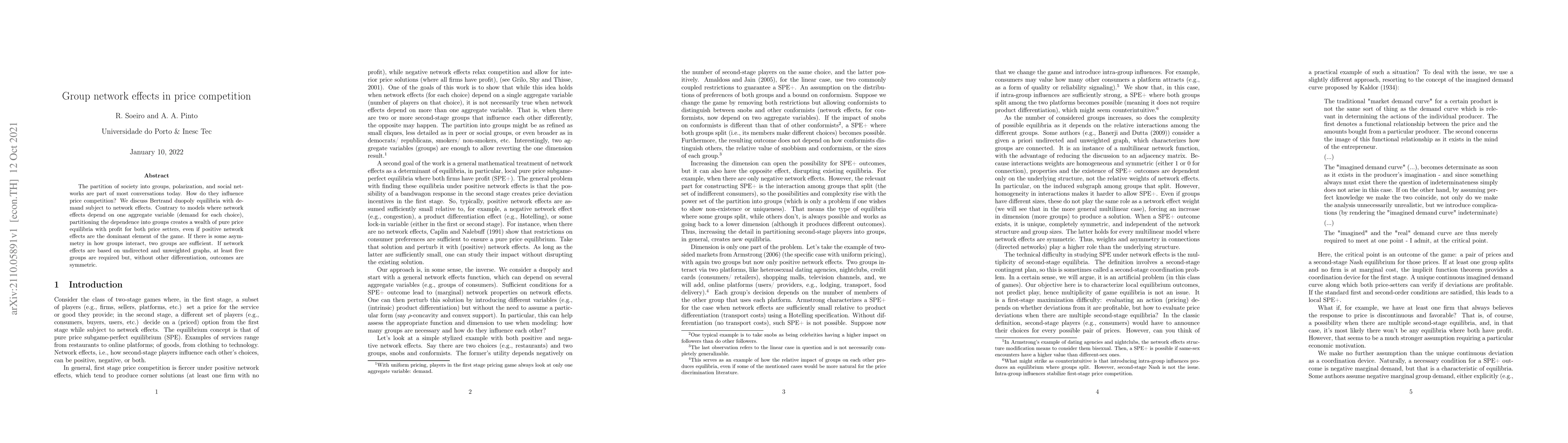 This paper explores how social group partitioning and network effects influence price competition in a Bertrand duopoly, revealing that partitioning demand into groups can lead to multiple pure price equilibria with profit for both competitors, even when network effects dominate. The study finds that asymmetry in group interactions can suffice for two groups, while undirected, unweighted networks require at least five groups for varied outcomes.