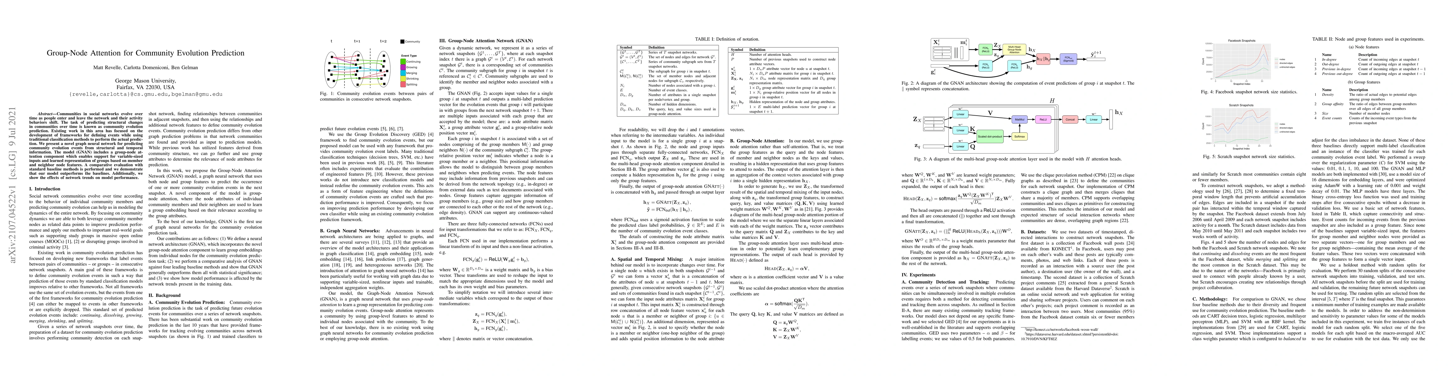 This paper introduces a novel graph neural network (GNAN) with a group-node attention component for predicting community evolution in social networks. The model outperforms traditional baselines by leveraging structural and temporal information, and it demonstrates variable-sized input support and learned group representations.