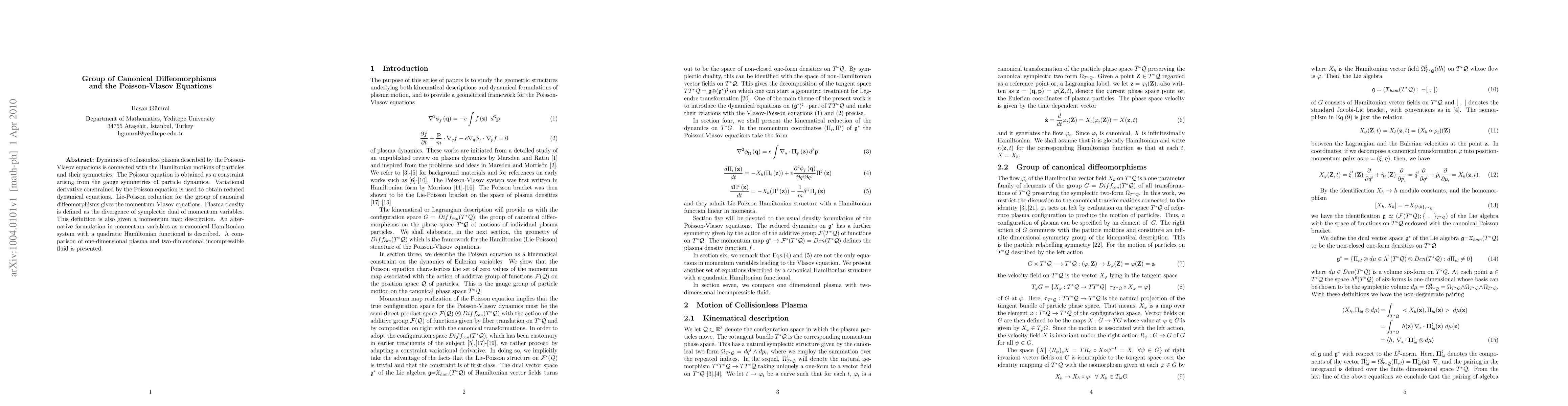 This paper explores the dynamics of collisionless plasma governed by Poisson-Vlasov equations, linking it to Hamiltonian particle motions and symmetries. It utilizes variational derivatives and Lie-Poisson reduction for canonical diffeomorphisms to derive reduced momentum-Vlasov equations, and contrasts plasma dynamics with two-dimensional incompressible fluid dynamics.