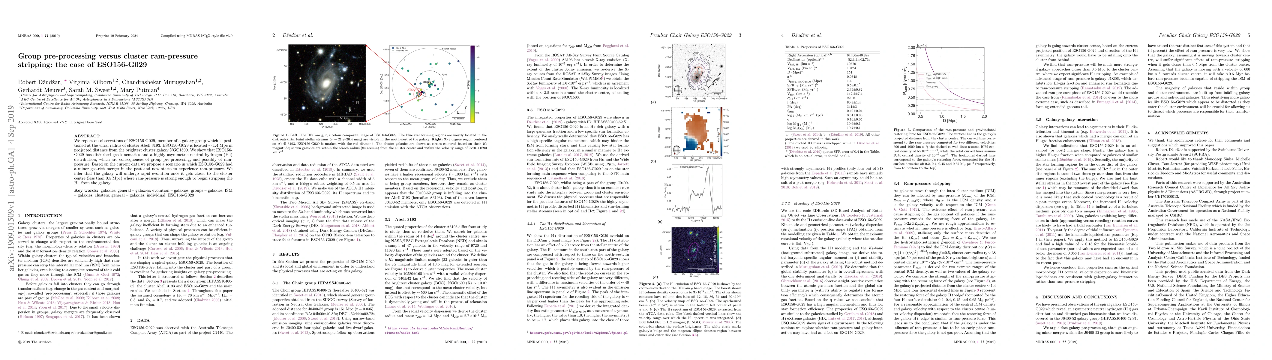 We report on observations of ESO156-G029, member of a galaxy group which is positioned at the virial radius of cluster Abell 3193. ESO156-G029 is located ~ 1.4 Mpc in projected distance from the brightest cluster galaxy NGC1500. We show that ESO156-G029 has disturbed gas kinematics and a highly asymmetric neutral hydrogen (HI) distribution, which are consequences of group pre-processing, and possibly of ram-pressure. Based on the current data we propose a scenario in which ESO156-G029 had a minor gas-rich merger in the past and now starts to experience ram-pressure. We infer that the galaxy will undergo rapid evolution once it gets closer to the cluster centre (less than 0.5 Mpc) where ram-pressure is strong enough to begin stripping the HI from the galaxy.
