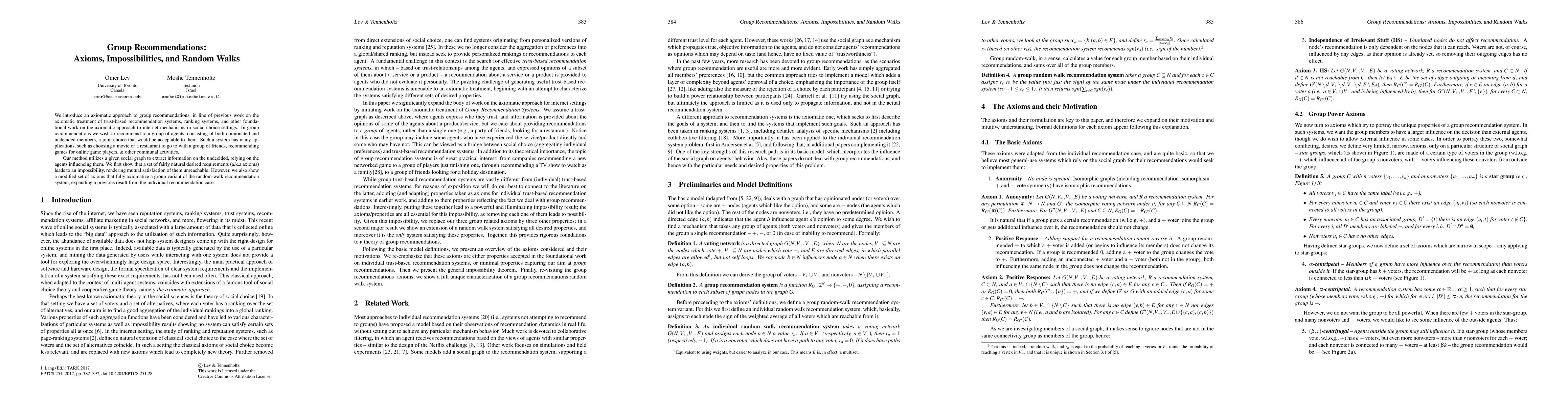 This paper presents an axiomatic framework for group recommendation systems, highlighting inherent impossibilities in satisfying natural requirements and proposing a modified set of axioms that aligns with a group variant of the random-walk recommendation model. The approach has applications in communal decision-making, such as choosing group activities.