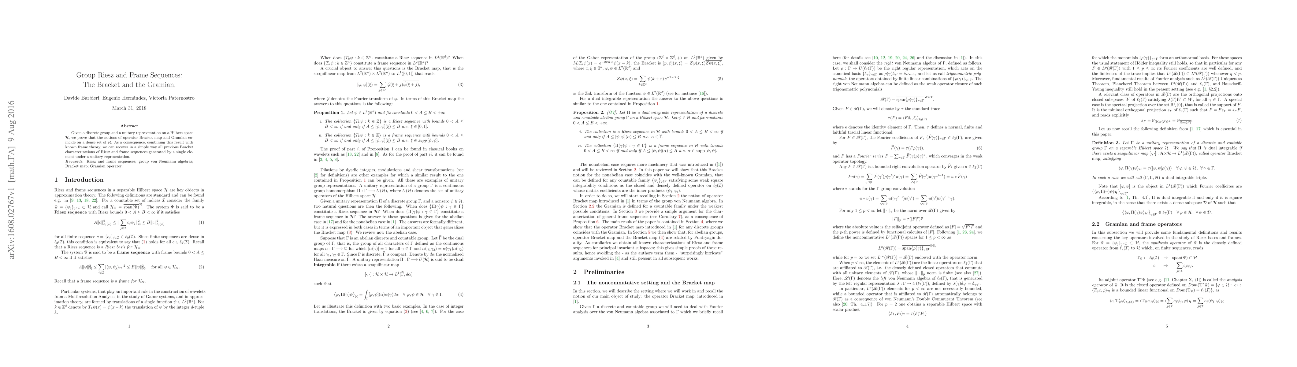 Given a discrete group and a unitary representation on a Hilbert space $\mathcal{H}$, we prove that the notions of operator Bracket map and Gramian coincide on a dense set of $\mathcal{H}$. As a consequence, combining this result with known frame theory, we can recover in a simple way all previous Bracket characterizations of Riesz and frame sequences generated by a single element under a unitary representation.