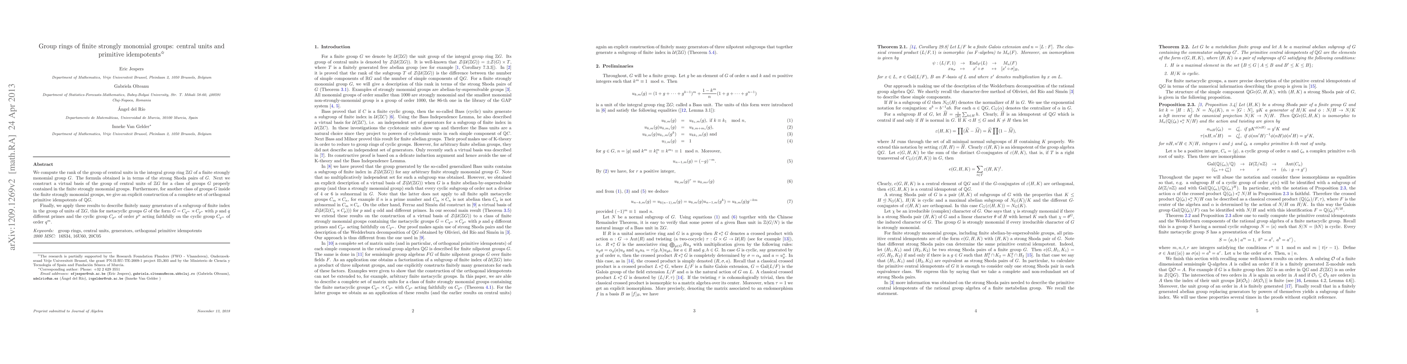 We compute the rank of the group of central units in the integral group ring $\Z G$ of a finite strongly monomial group $G$. The formula obtained is in terms of the strong Shoda pairs of $G$. Next we construct a virtual basis of the group of central units of $\Z G$ for a class of groups $G$ properly contained in the finite strongly monomial groups. Furthermore, for another class of groups $G$ inside the finite strongly monomial groups, we give an explicit construction of a complete set of orthogonal primitive idempotents of $\Q G$. Finally, we apply these results to describe finitely many generators of a subgroup of finite index in the group of units of $\Z G$, this for metacyclic groups $G$ of the form $G=C_{q^m}\rtimes C_{p^n}$ with $p$ and $q$ different primes and the cyclic group $C_{p^n}$ of order $p^n$ acting faithfully on the cyclic group $C_{q^m}$ of order $q^m$.