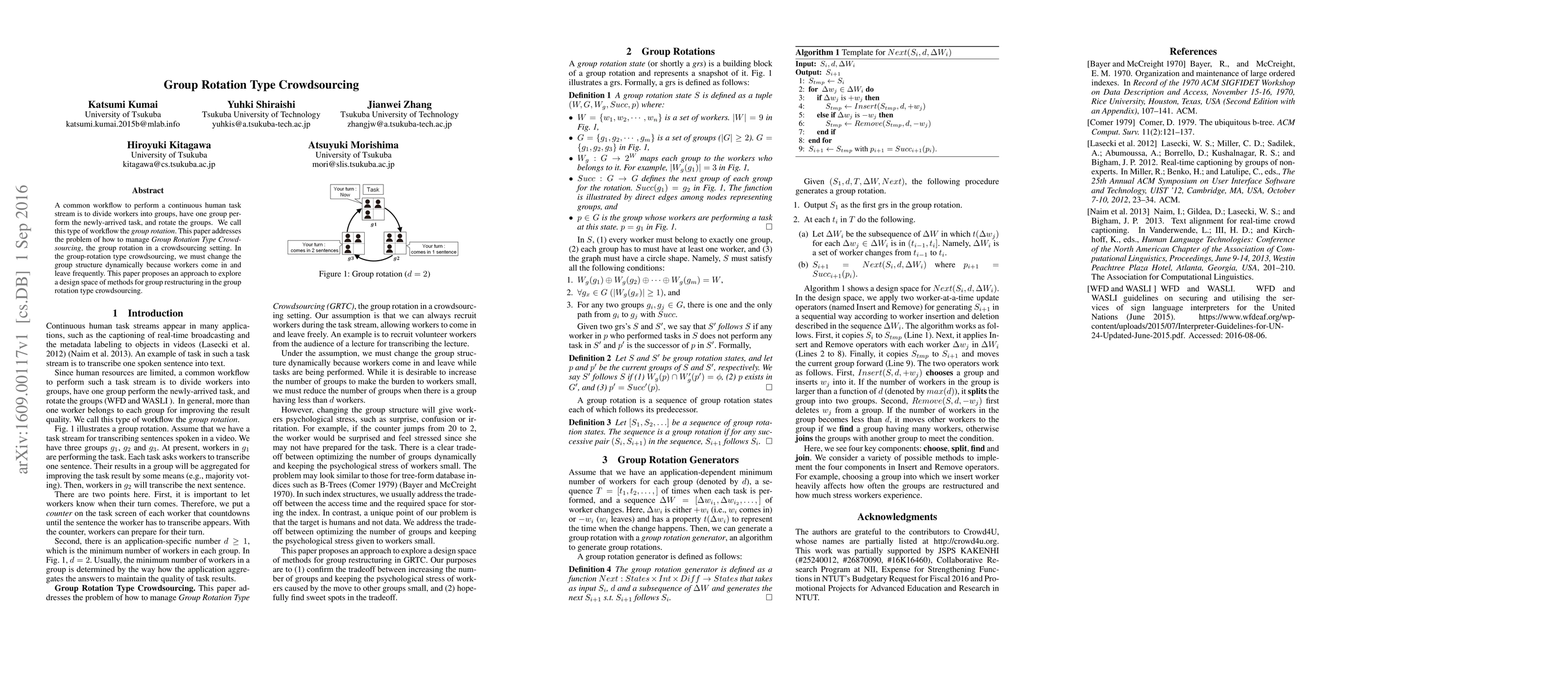 A common workflow to perform a continuous human task stream is to divide workers into groups, have one group perform the newly-arrived task, and rotate the groups. We call this type of workflow the group rotation. This paper addresses the problem of how to manage Group Rotation Type Crowdsourcing, the group rotation in a crowdsourcing setting. In the group-rotation type crowdsourcing, we must change the group structure dynamically because workers come in and leave frequently. This paper proposes an approach to explore a design space of methods for group restructuring in the group rotation type crowdsourcing.