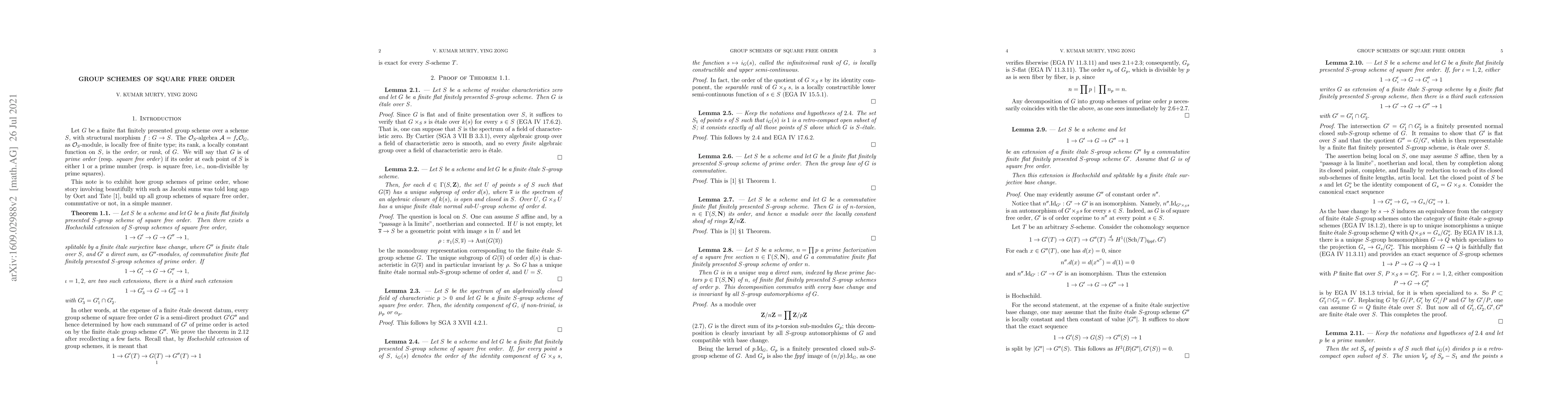 Every finite flat finitely presented group scheme G of square free order over a scheme S can be written as an extension of a finite etale S-group scheme G" by a commutative finite flat finitely presented S-group scheme G' that is a direct sum of group schemes of prime order. Such an extension splits over a finite etale surjective base change.