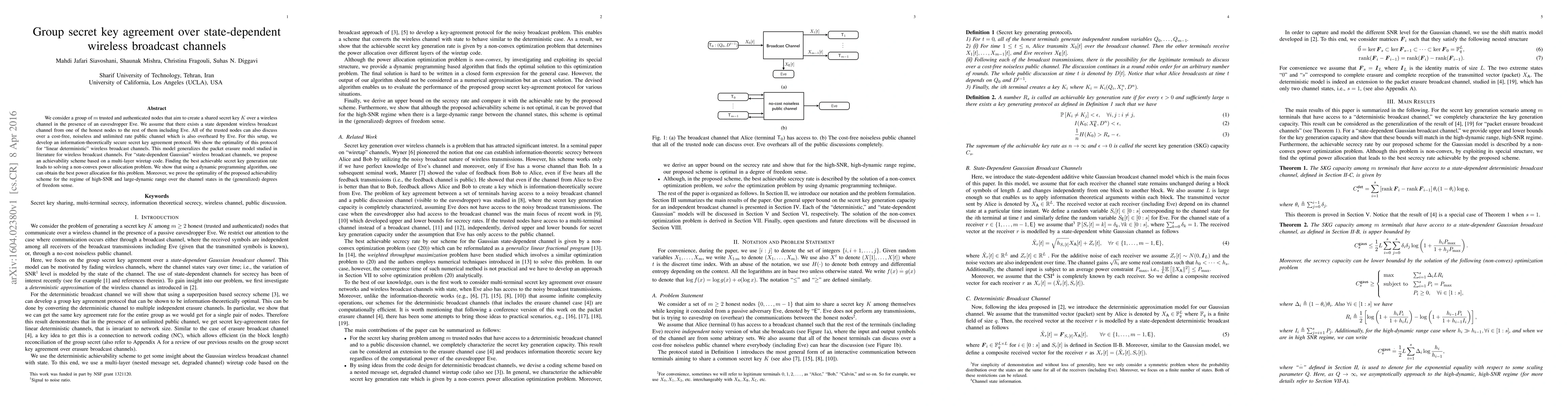 We consider a group of $m$ trusted and authenticated nodes that aim to create a shared secret key $K$ over a wireless channel in the presence of an eavesdropper Eve. We assume that there exists a state dependent wireless broadcast channel from one of the honest nodes to the rest of them including Eve. All of the trusted nodes can also discuss over a cost-free, noiseless and unlimited rate public channel which is also overheard by Eve. For this setup, we develop an information-theoretically secure secret key agreement protocol. We show the optimality of this protocol for "linear deterministic" wireless broadcast channels. This model generalizes the packet erasure model studied in literature for wireless broadcast channels. For "state-dependent Gaussian" wireless broadcast channels, we propose an achievability scheme based on a multi-layer wiretap code. Finding the best achievable secret key generation rate leads to solving a non-convex power allocation problem. We show that using a dynamic programming algorithm, one can obtain the best power allocation for this problem. Moreover, we prove the optimality of the proposed achievability scheme for the regime of high-SNR and large-dynamic range over the channel states in the (generalized) degrees of freedom sense.