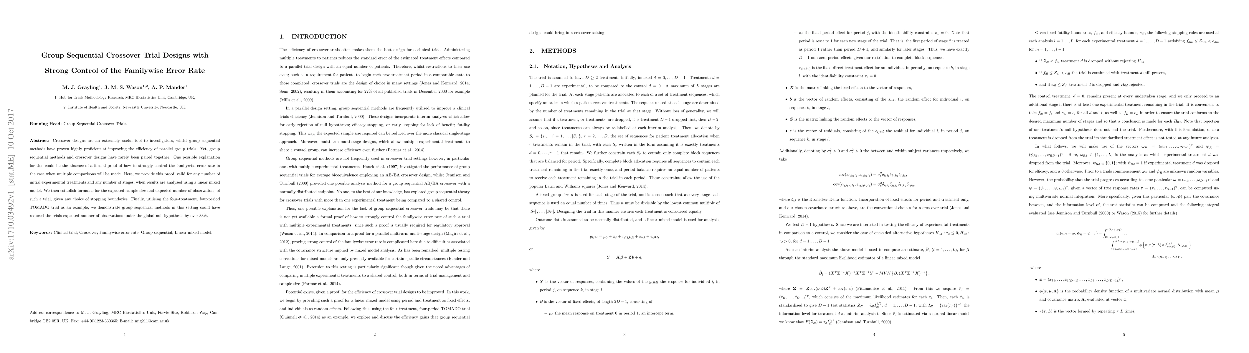 This paper presents a method for combining group sequential designs with crossover trials to maintain strong control of the familywise error rate, providing a proof for multiple comparisons and establishing formulae for expected sample size and observations. The approach is demonstrated to reduce the number of observations in a four-treatment trial by over 33% under the global null hypothesis.