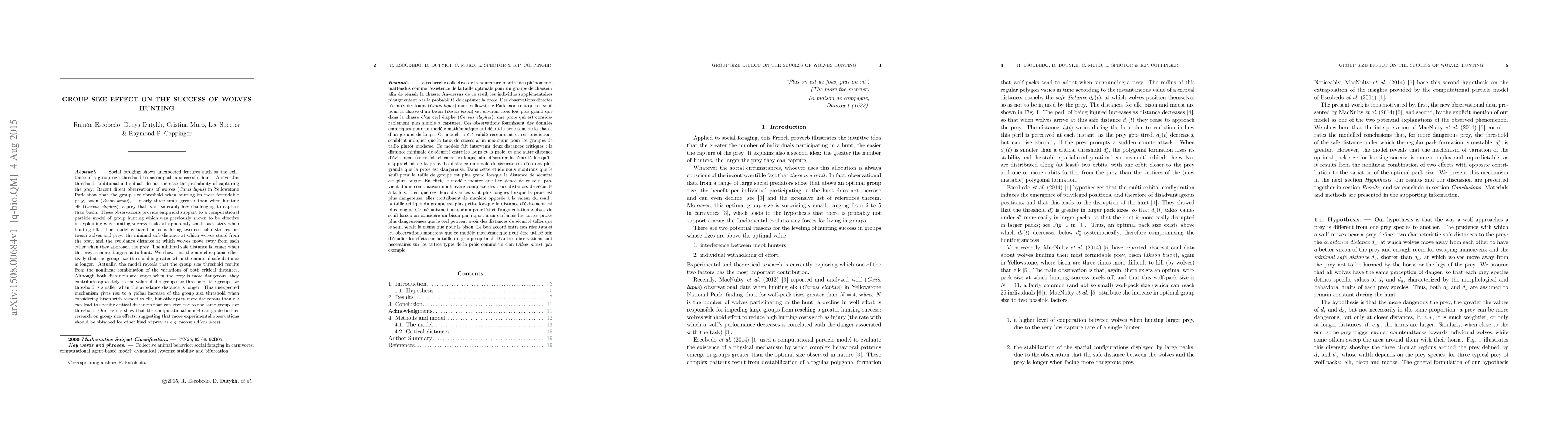 Social foraging shows unexpected features such as the existence of a group size threshold to accomplish a successful hunt. Above this threshold, additional individuals do not increase the probability of capturing the prey. Recent direct observations of wolves in Yellowstone Park show that the group size threshold when hunting its most formidable prey, bison, is nearly three times greater than when hunting elk, a prey that is considerably less challenging to capture than bison. These observations provide empirical support to a computational particle model of group hunting which was previously shown to be effective in explaining why hunting success peaks at apparently small pack sizes when hunting elk. The model is based on considering two critical distances between wolves and prey: the minimal safe distance at which wolves stand from the prey, and the avoidance distance at which wolves move away from each other when they approach the prey. The minimal safe distance is longer when the prey is more dangerous to hunt. We show that the model explains effectively that the group size threshold is greater when the minimal safe distance is longer. Although both distances are longer when the prey is more dangerous, they contribute oppositely to the value of the group size threshold: the group size threshold is smaller when the avoidance distance is longer. This unexpected mechanism gives rise to a global increase of the group size threshold when considering bison with respect to elk, but other prey more dangerous than elk can lead to specific critical distances that can give rise to the same group size threshold. Our results show that the computational model can guide further research on group size effects, suggesting that more experimental observations should be obtained for other kind of prey as e.g. moose.
