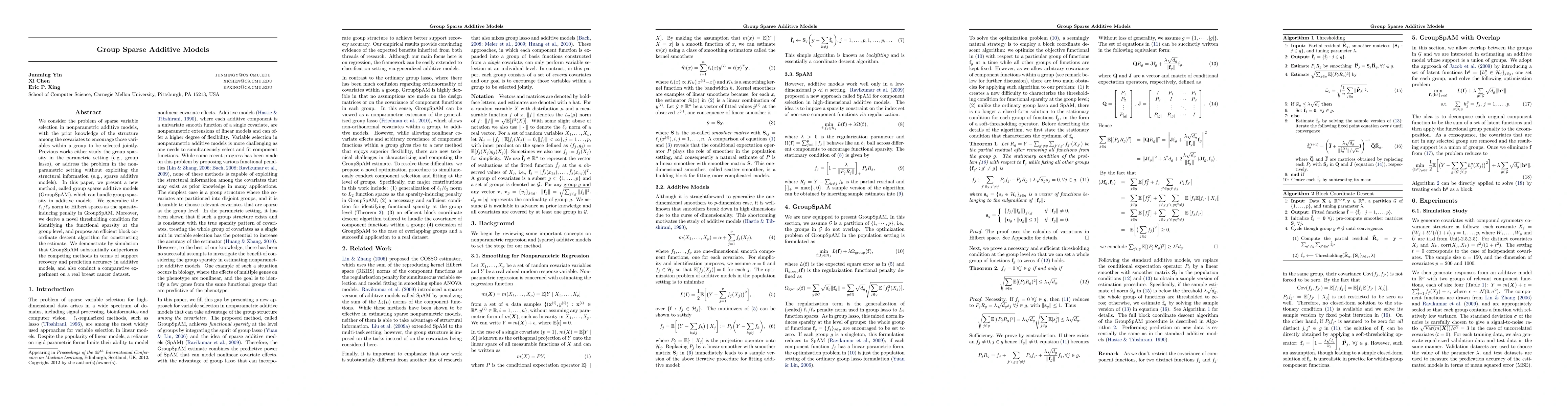 This paper introduces Group Sparse Additive Models (GroupSpAM) to handle group sparsity in nonparametric additive models, leveraging structural information among covariates. It proposes a novel method using an l1/l2 norm in Hilbert spaces and an efficient block coordinate descent algorithm, outperforming existing methods in simulations and a real breast cancer dataset.