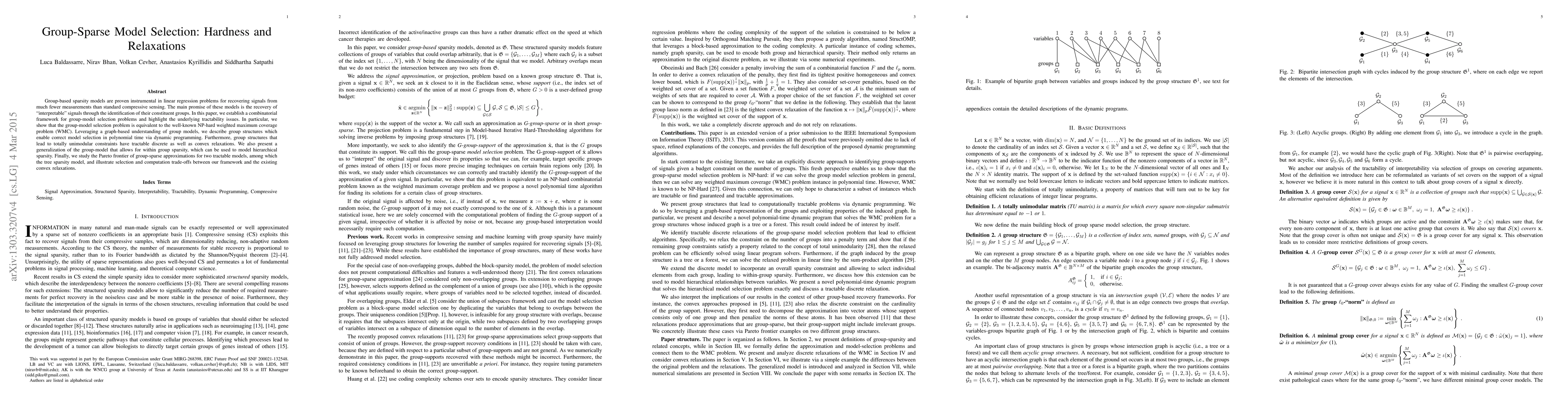 This paper establishes a combinatorial framework for group-model selection in linear regression, proving its equivalence to the NP-hard WMC problem. It identifies group structures enabling polynomial-time selection via dynamic programming and tractable discrete and convex relaxations, and generalizes the group model to allow within-group sparsity.