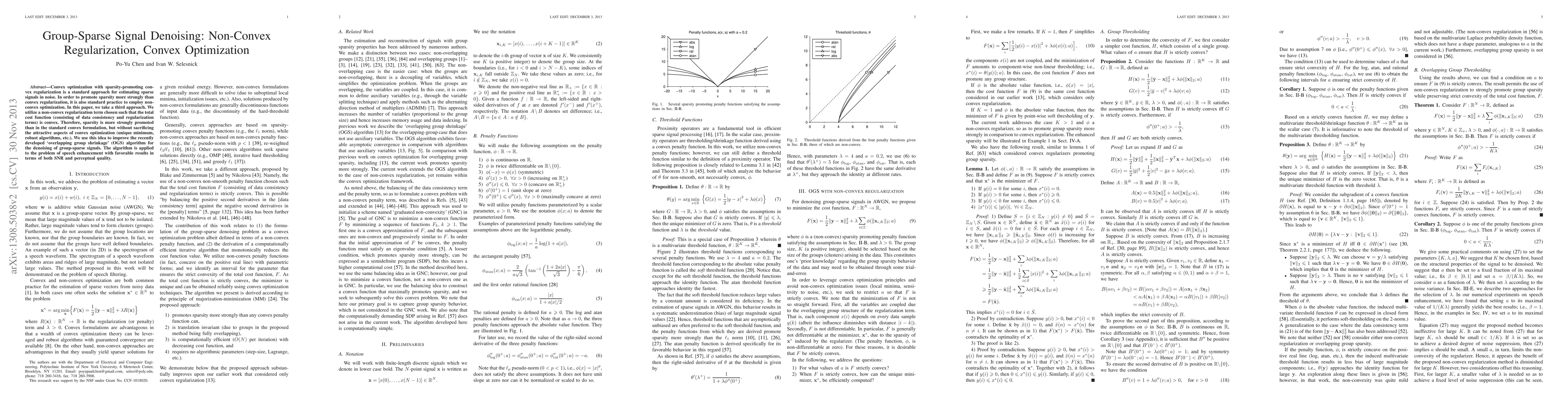 This paper proposes a non-convex regularization approach that maintains convex optimization, thereby promoting stronger sparsity than standard convex methods while preserving benefits like unique minima and robust algorithms. The improved 'overlapping group shrinkage' (OGS) algorithm is applied to speech enhancement, achieving better SNR and perceptual quality.
