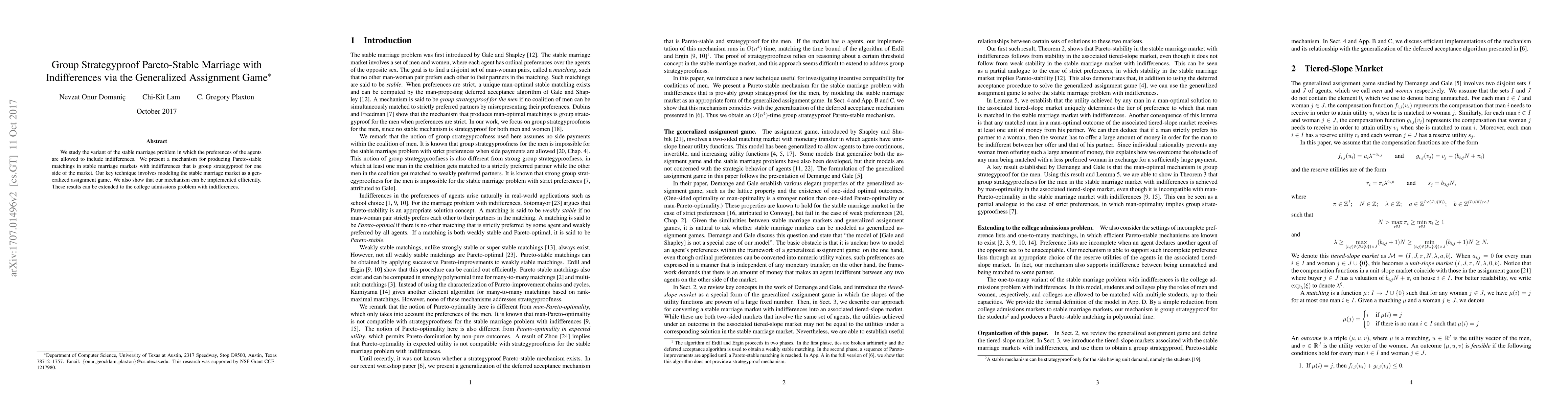The paper employs a generalized assignment game framework to model stable marriage markets with indifferences, utilizing group strategyproof mechanisms.