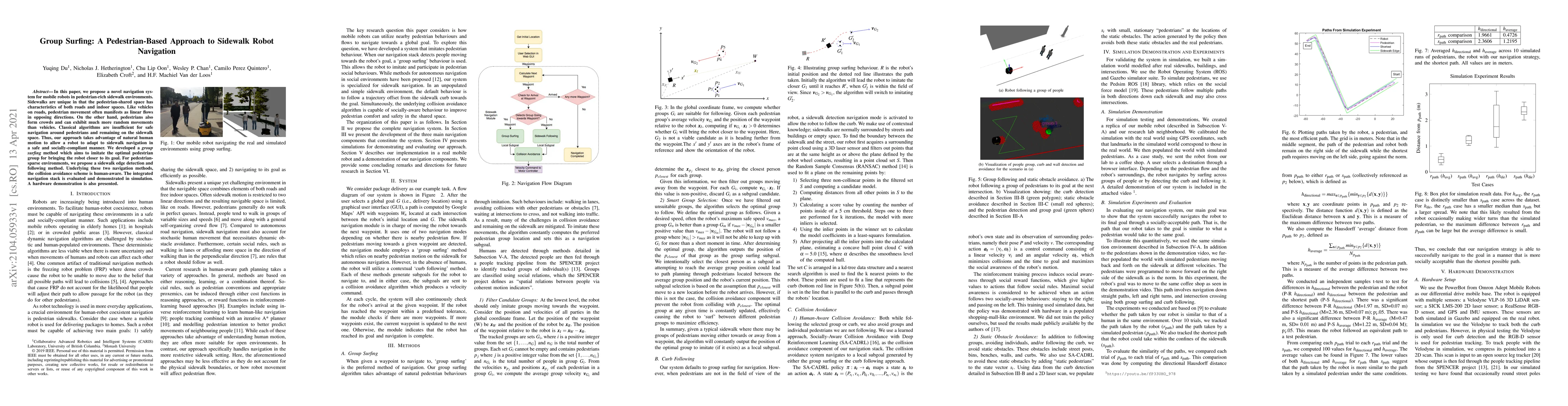 This paper introduces a pedestrian-based navigation system for mobile robots in sidewalk environments, proposing a "group surfing" method to mimic optimal pedestrian groups for safe navigation and a sidewalk edge detection method for sparse pedestrian areas, all underpinned by a human-aware collision avoidance scheme. The system is evaluated in simulation and demonstrated on hardware.