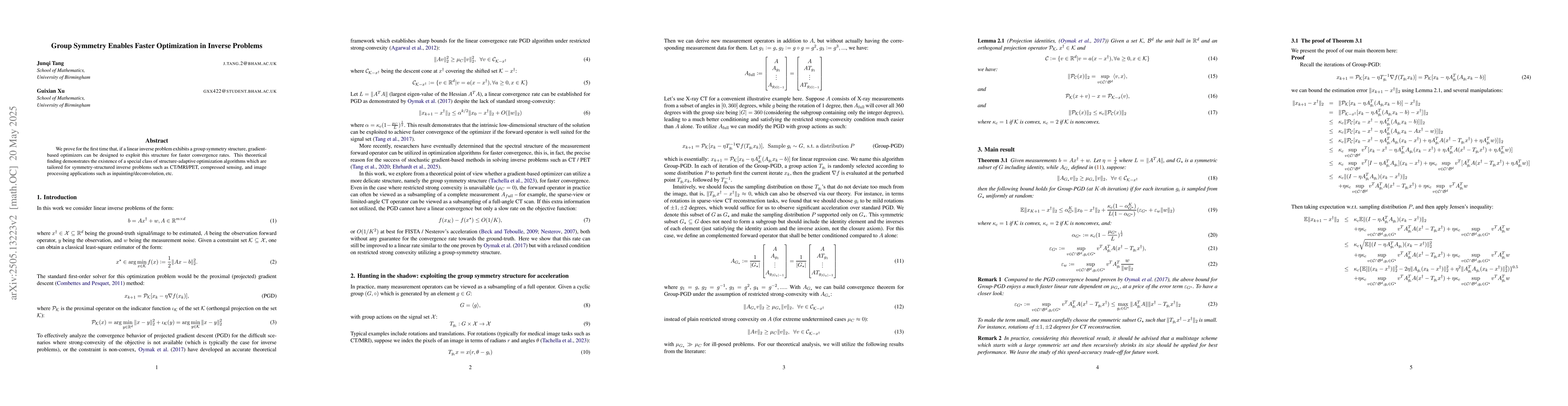The paper presents the first theoretical proof that group symmetry in linear inverse problems can be exploited for faster optimization convergence rates.
