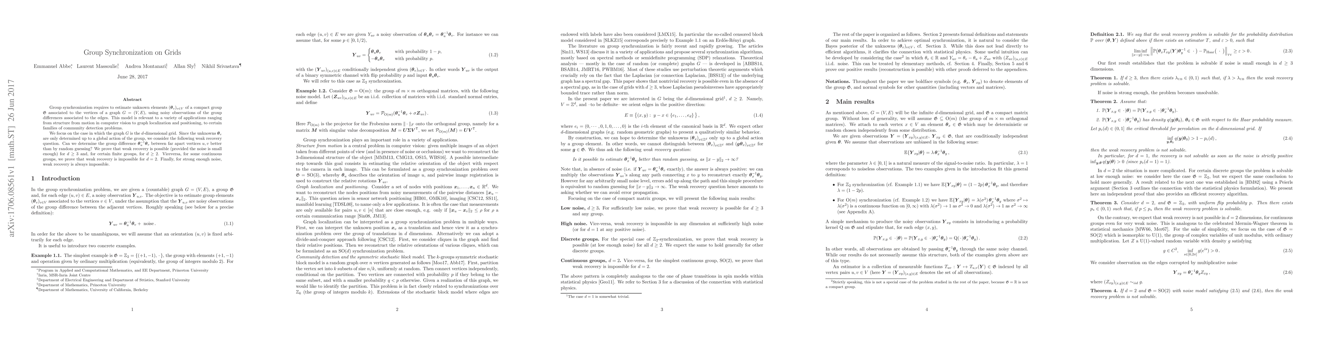 Group synchronization requires to estimate unknown elements $({\theta}_v)_{v\in V}$ of a compact group ${\mathfrak G}$ associated to the vertices of a graph $G=(V,E)$, using noisy observations of the group differences associated to the edges. This model is relevant to a variety of applications ranging from structure from motion in computer vision to graph localization and positioning, to certain families of community detection problems. We focus on the case in which the graph $G$ is the $d$-dimensional grid. Since the unknowns ${\boldsymbol \theta}_v$ are only determined up to a global action of the group, we consider the following weak recovery question. Can we determine the group difference ${\theta}_u^{-1}{\theta}_v$ between far apart vertices $u, v$ better than by random guessing? We prove that weak recovery is possible (provided the noise is small enough) for $d\ge 3$ and, for certain finite groups, for $d\ge 2$. Viceversa, for some continuous groups, we prove that weak recovery is impossible for $d=2$. Finally, for strong enough noise, weak recovery is always impossible.