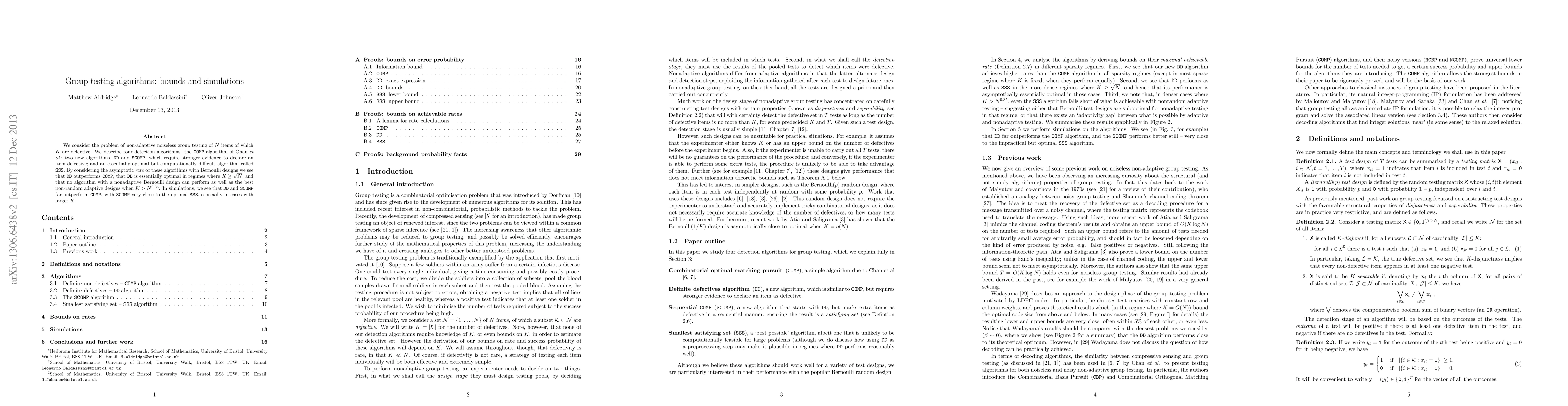 We consider the problem of non-adaptive noiseless group testing of $N$ items of which $K$ are defective. We describe four detection algorithms: the COMP algorithm of Chan et al.; two new algorithms, DD and SCOMP, which require stronger evidence to declare an item defective; and an essentially optimal but computationally difficult algorithm called SSS. By considering the asymptotic rate of these algorithms with Bernoulli designs we see that DD outperforms COMP, that DD is essentially optimal in regimes where $K \geq \sqrt N$, and that no algorithm with a nonadaptive Bernoulli design can perform as well as the best non-random adaptive designs when $K > N^{0.35}$. In simulations, we see that DD and SCOMP far outperform COMP, with SCOMP very close to the optimal SSS, especially in cases with larger $K$.