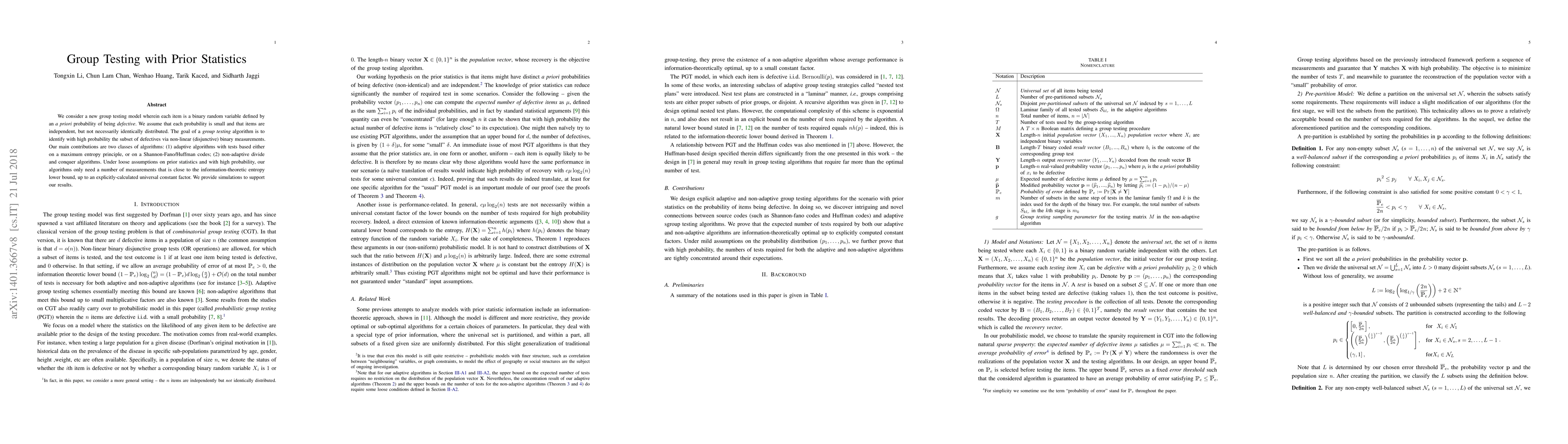 We consider a new group testing model wherein each item is a binary random variable defined by an a priori probability of being defective. We assume that each probability is small and that items are independent, but not necessarily identically distributed. The goal of group testing algorithms is to identify with high probability the subset of defectives via non-linear (disjunctive) binary measurements. Our main contributions are two classes of algorithms: (1) adaptive algorithms with tests based either on a maximum entropy principle, or on a Shannon-Fano/Huffman code; (2) non-adaptive algorithms. Under loose assumptions and with high probability, our algorithms only need a number of measurements that is close to the information-theoretic lower bound, up to an explicitly-calculated universal constant factor. We provide simulations to support our results.