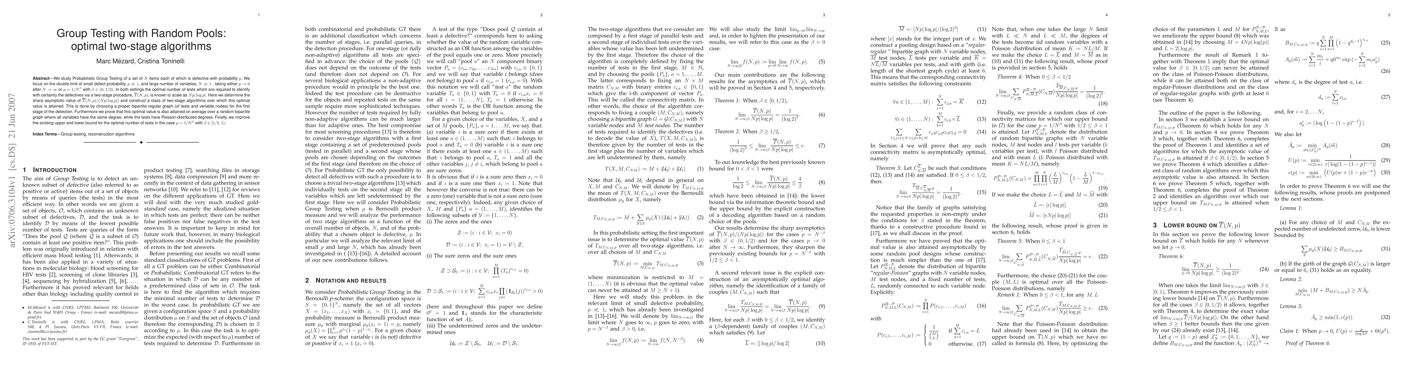 This paper investigates optimal two-stage algorithms for probabilistic group testing under small defect probabilities and large numbers of items, determining the exact asymptotic scaling of the optimal number of tests and constructing algorithms that achieve this scaling. It also proves the optimality of these algorithms on average over random bipartite graphs.