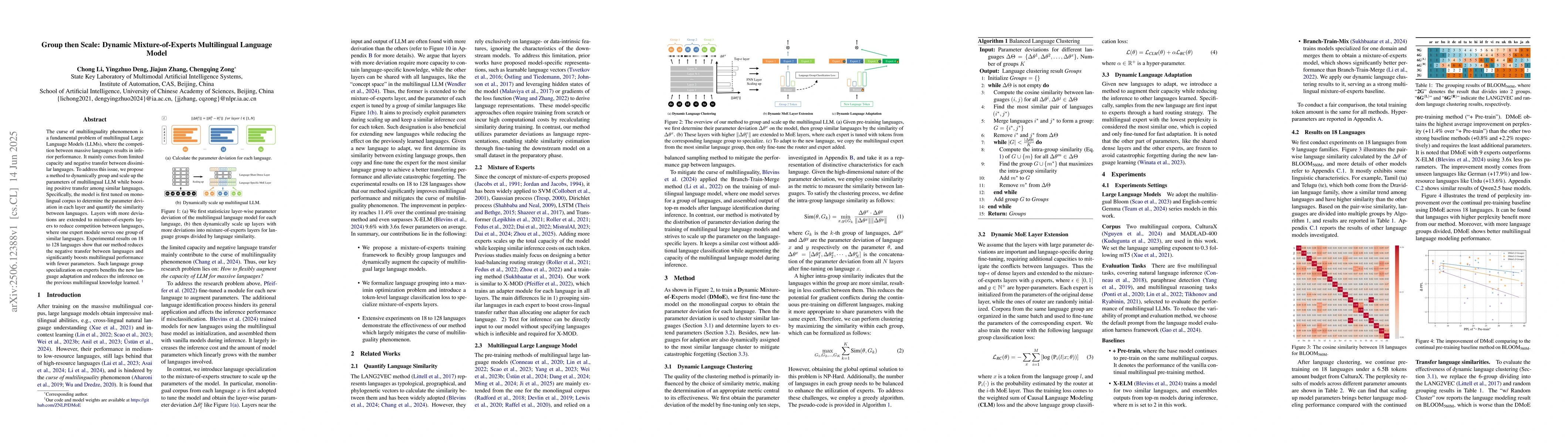 The curse of multilinguality phenomenon is a fundamental problem of multilingual Large Language Models (LLMs), where the competition between massive languages results in inferior performance. It mainly comes from limited capacity and negative transfer between dissimilar languages. To address this issue, we propose a method to dynamically group and scale up the parameters of multilingual LLM while boosting positive transfer among similar languages. Specifically, the model is first tuned on monolingual corpus to determine the parameter deviation in each layer and quantify the similarity between languages. Layers with more deviations are extended to mixture-of-experts layers to reduce competition between languages, where one expert module serves one group of similar languages. Experimental results on 18 to 128 languages show that our method reduces the negative transfer between languages and significantly boosts multilingual performance with fewer parameters. Such language group specialization on experts benefits the new language adaptation and reduces the inference on the previous multilingual knowledge learned.