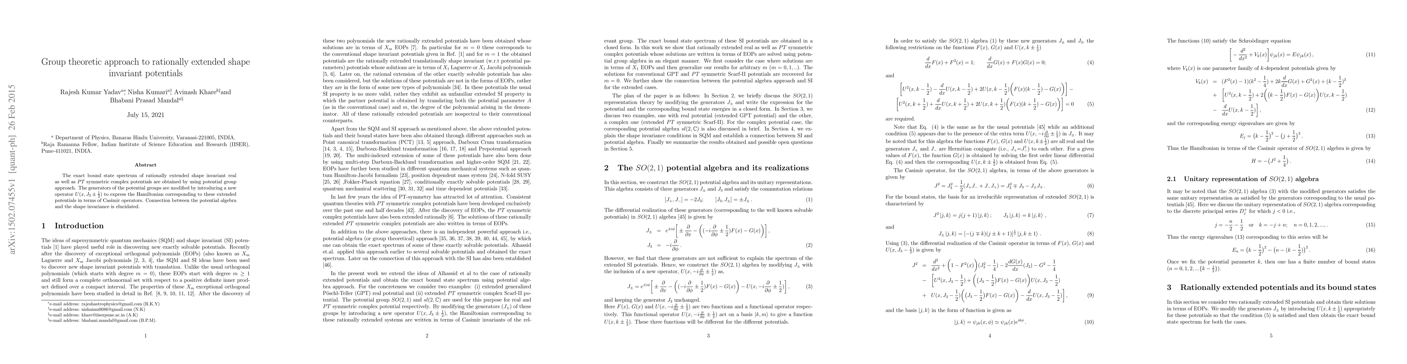 This paper employs a group theoretic approach to derive the exact bound state spectra of rationally extended shape invariant potentials, introducing a new operator to express the Hamiltonian in terms of Casimir operators and elucidating the connection between potential algebra and shape invariance.